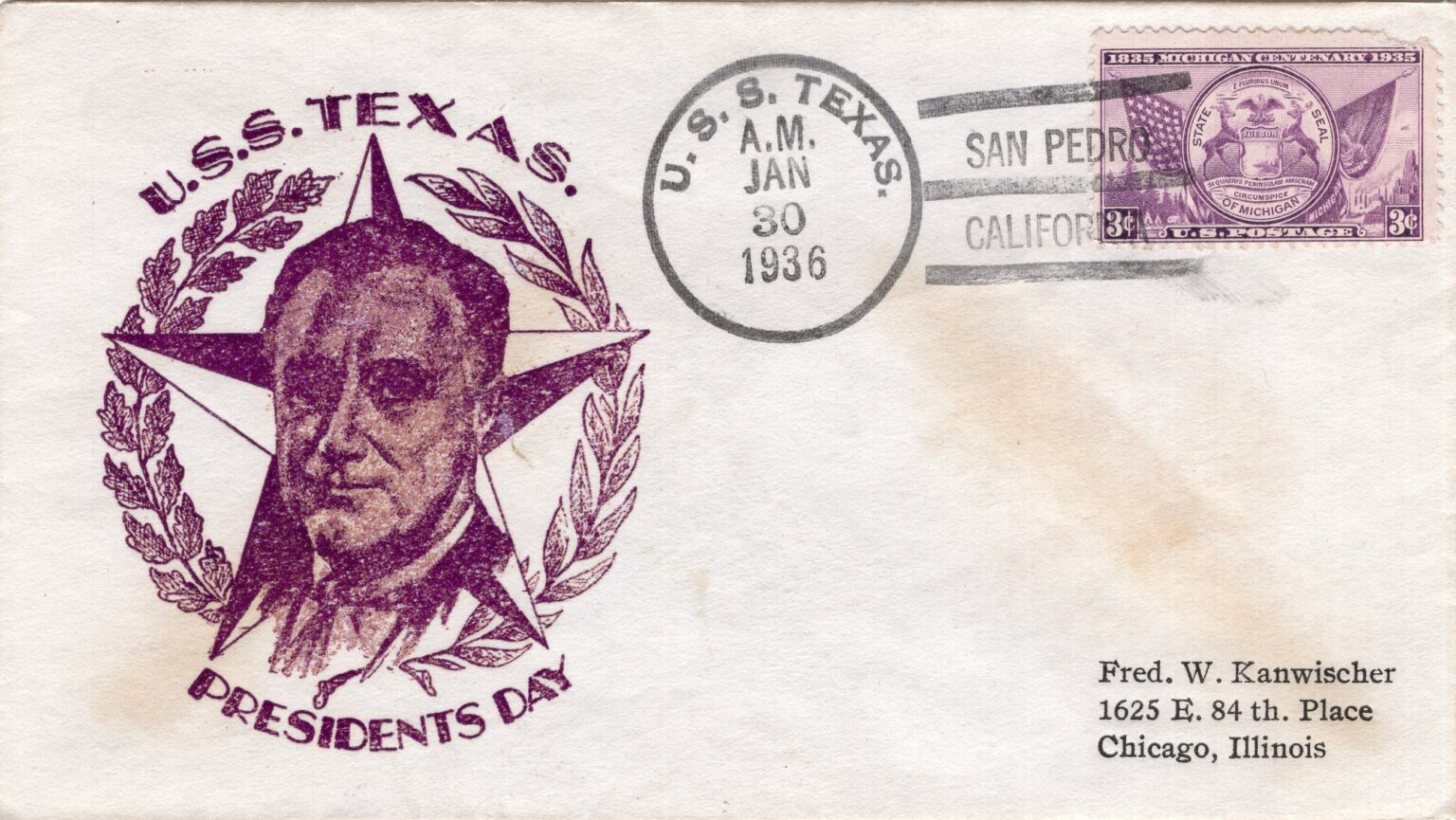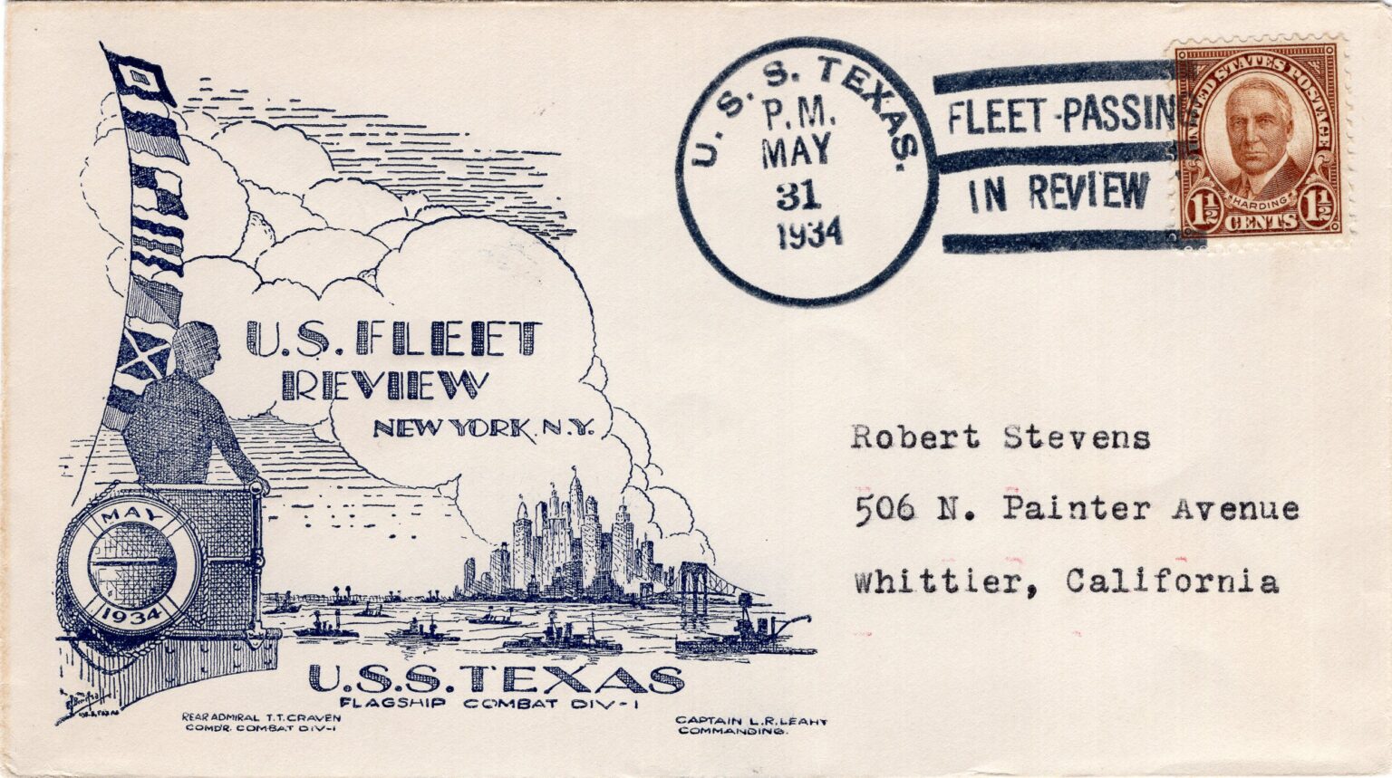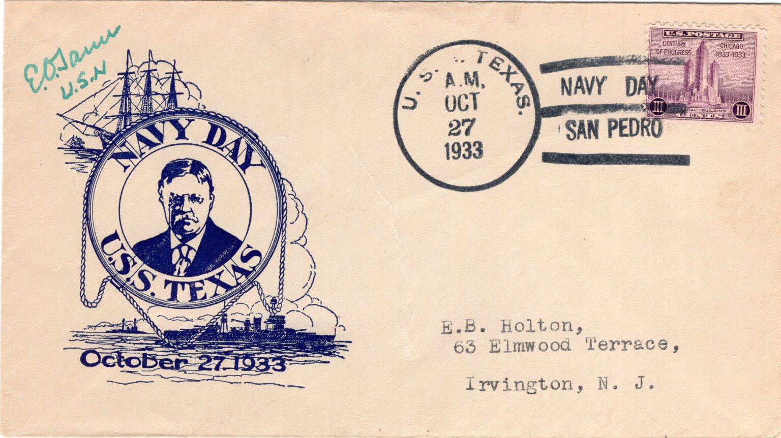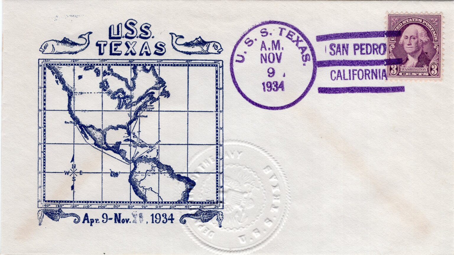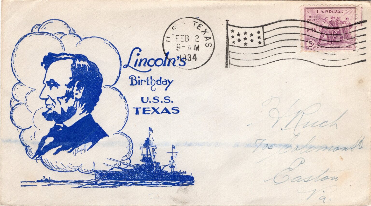 Many crew members spread their art throughout the ship and beyond to the homefront. Men on Texas sponsored and designed naval covers for envelopes in a practice that became heavily popularized in the 1930s. The trend was not unique to Texas, and widely featured throughout the entire fleet. Covers could encompass a wide variety of modes. Collage, small oil painting directly on the envelope, stickers or pasted on cutouts, and even just pen and pencil were common. The most common variant on Texas was block printing, using ink stamps to decorate many different envelopes and allowing a single design a wider audience. The practice was most popular on holidays and special events when and where the ship may be. Designs were typically monochromatic, where multiple colors often indicated a confluence of individual illustrations. Eric O. Tauer, Sidney N. Bremer, and Elmer J. Birdsall were amongst the more prolific designers and heavily feature on many envelopes donated to Battleship Texas Foundation. While they would again adorn the faces of envelopes following World War II, the war years saw a hiatus from the activity in lieu of more cost-effective methods of mail transportation which relegated envelopes unnecessary.