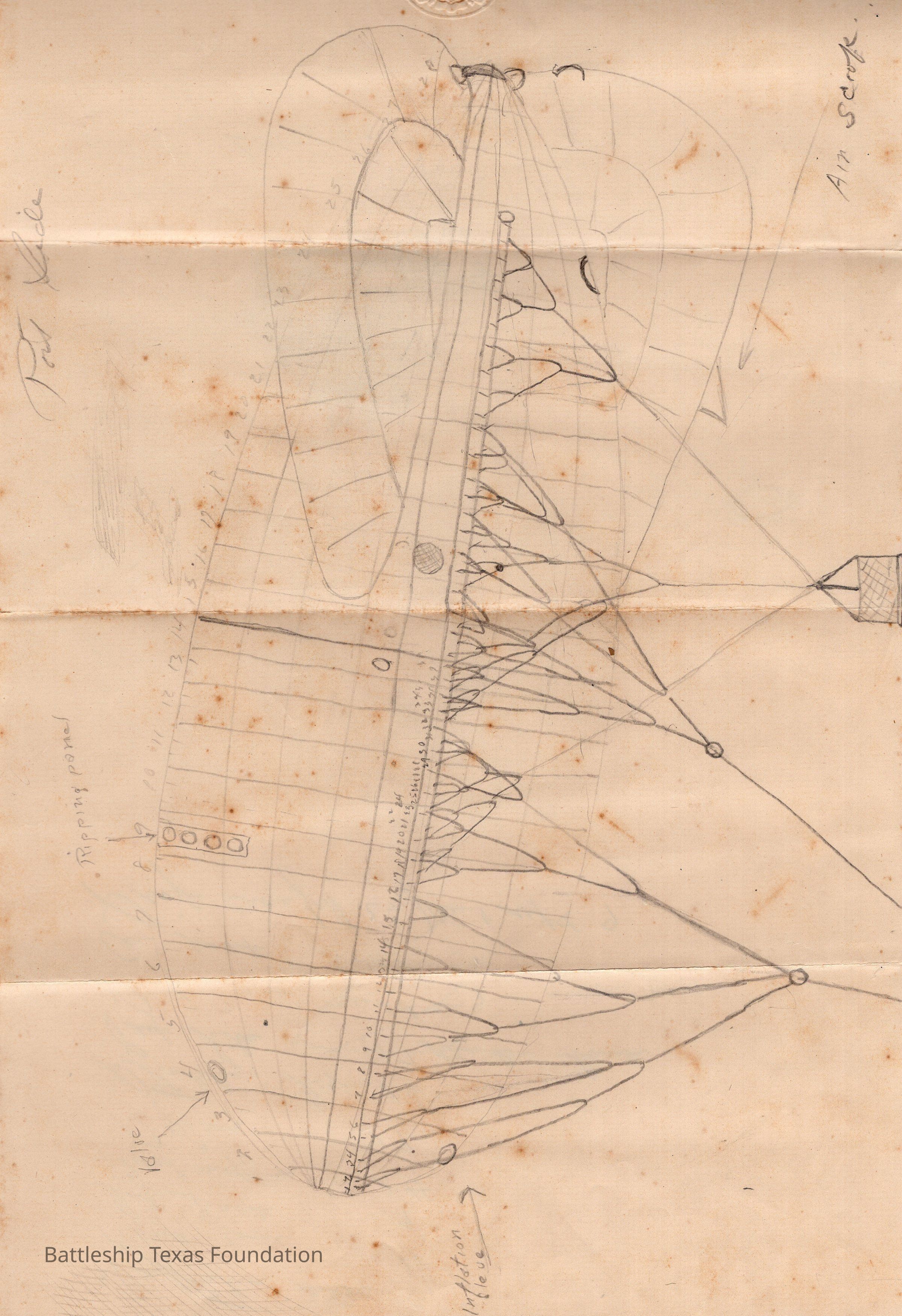 Drawing on paper of a kite balloon. Back has a sketch of a hut with "let's go" written under it. Other notes on top of back of page.