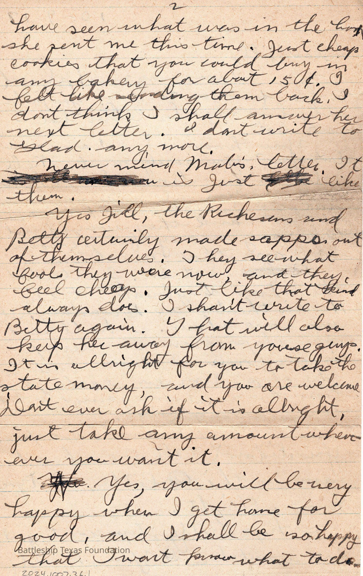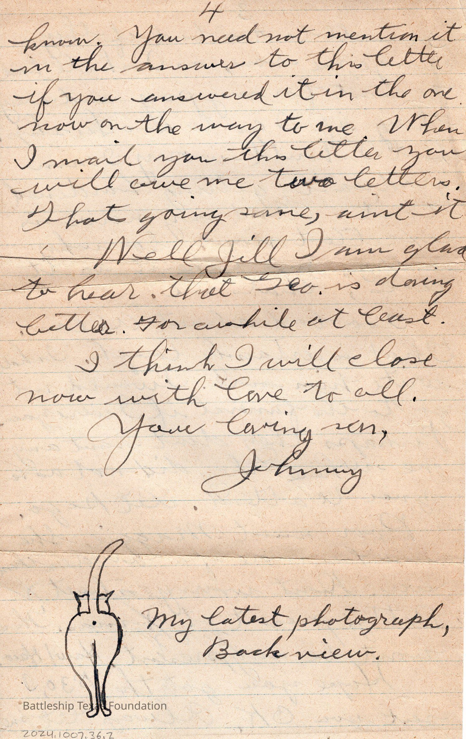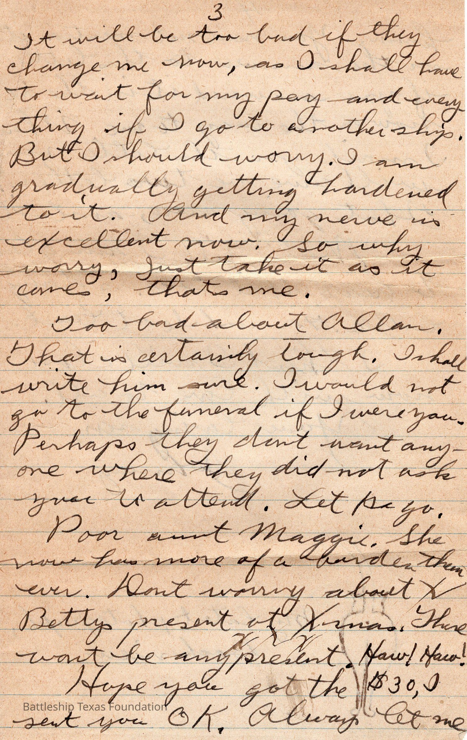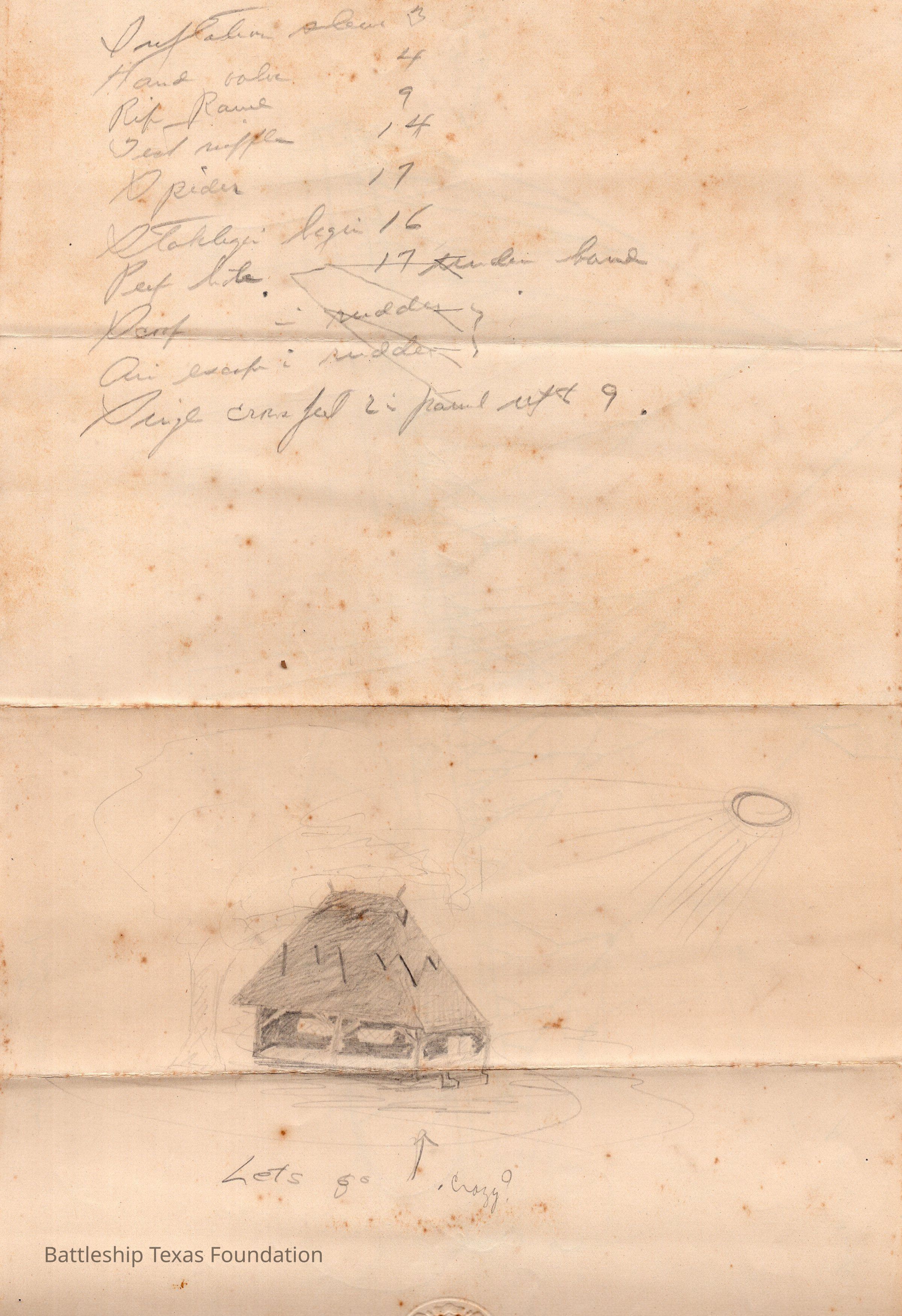 During the early history of Battleship Texas and especially during World War I, art was done sparingly in free moments or snuck in while on duty. Much that was done was in the form of sketches with pencil and paper. John F. Lamson, a machinist mate during World War I occasionally graced the back of letters to his family with sketches of cat behinds and remarked on his “latest photograph.” Another crew member, William K. Wilbur was sent to train in kite balloon operations at the Royal Naval Air School in Roehampton, England during the war. While his notes are filled with sketches of balloons, circuit diagrams, and myriad notes recorded to page, the back of one shows a bungalow resting in the shade of a large tree as the sun beats down overhead. A simple note adorns the bottom, “Let’s go” with an arrow pointing to the sketch and, “Crazy?” Whether Lamson’s move to humor, or Wilbur’s desire for a tropical respite, both men demonstrated a desire for reprieve from their current situation. Interestingly, Lamson’s sketches only appear on his letters before Texas made the journey to link with the British Grand Fleet, while none appear when on actual patrol, replaced with thoughts of anxiety and a desire to return home. Wilbur’s artwork demonstrates a similar sentiment, a desire to be elsewhere in the face of the Great War.