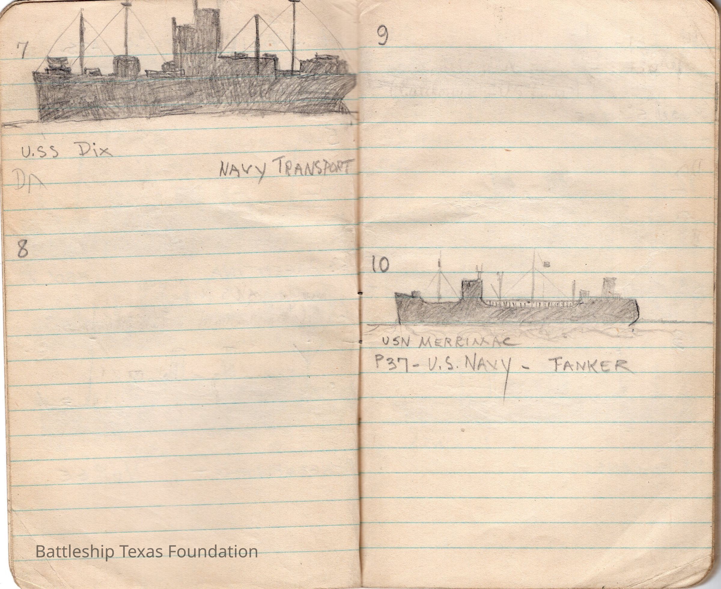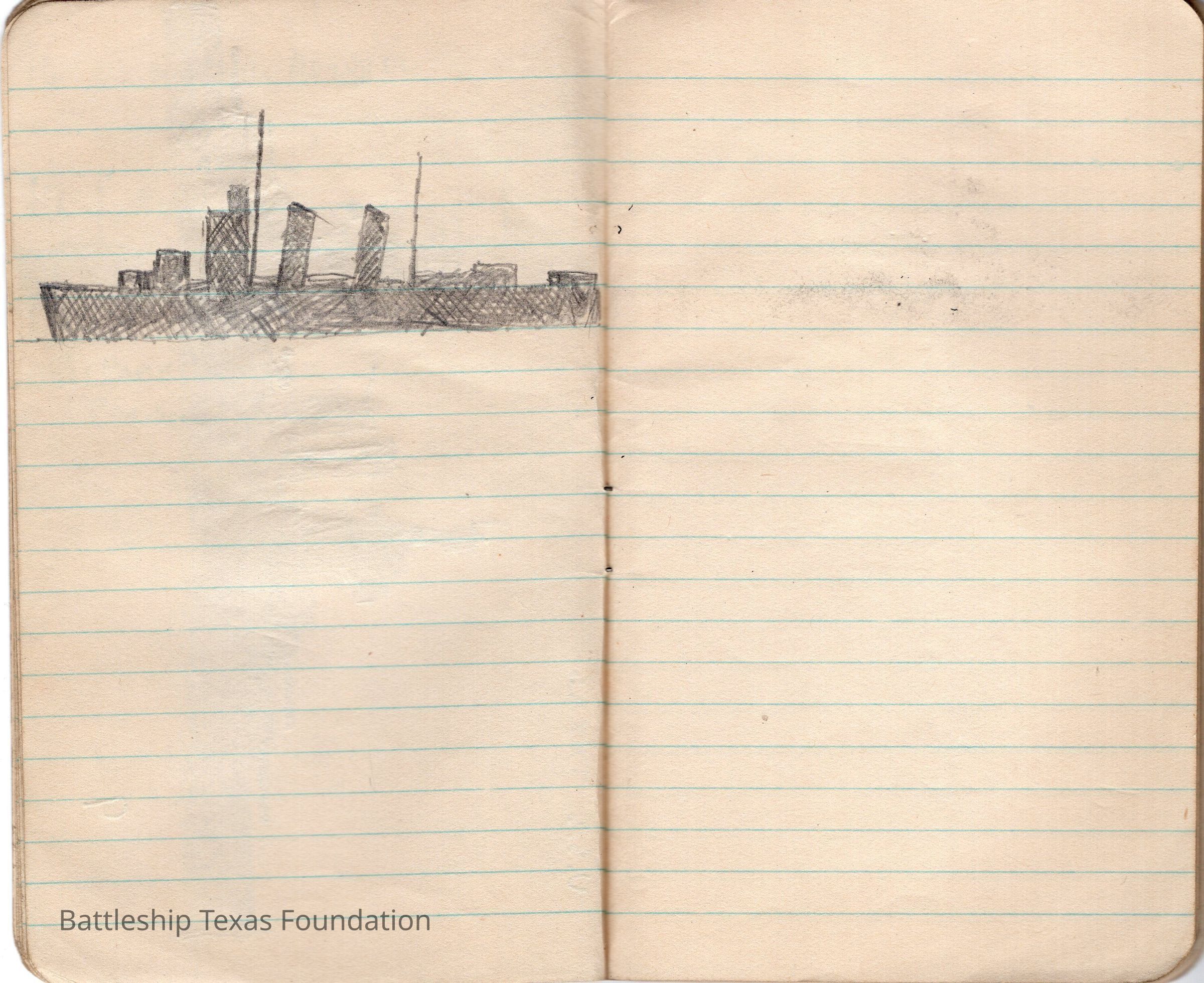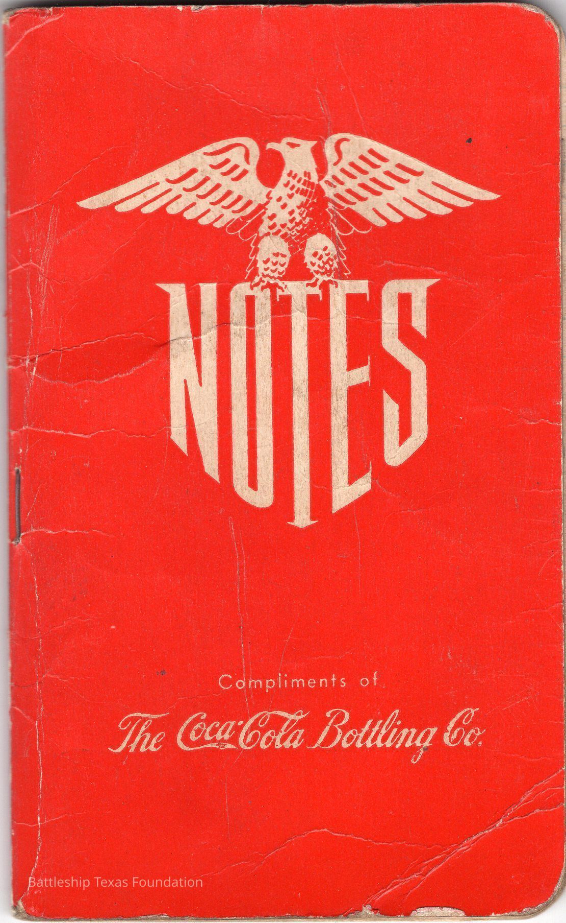 Notebook drawings by Major Alton E. Horton of the fleet Texas was a part of in 1943. Red cover with eagle perched on "NOTES" title. Bottom of the cover notes the book a product of the Coca-Cola Bottling Company. Notable ships included in the fleet drawings are USS Texas on page 9 and USS Santee (CVE-29) on page 6.