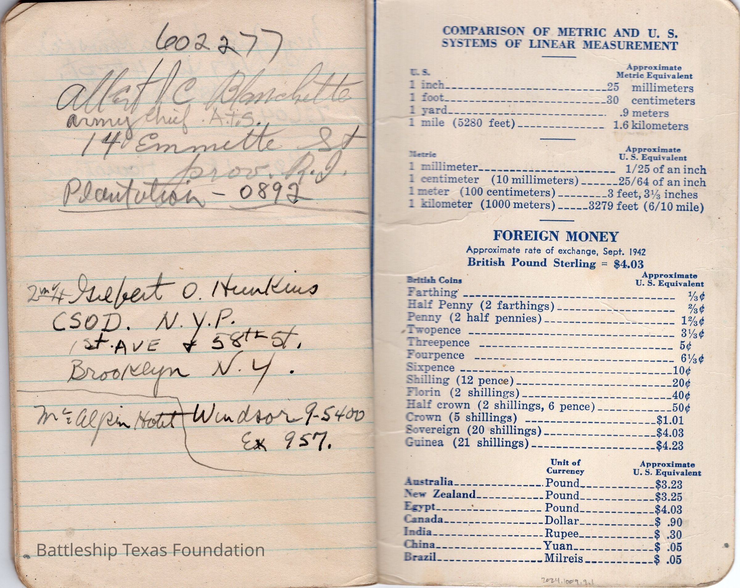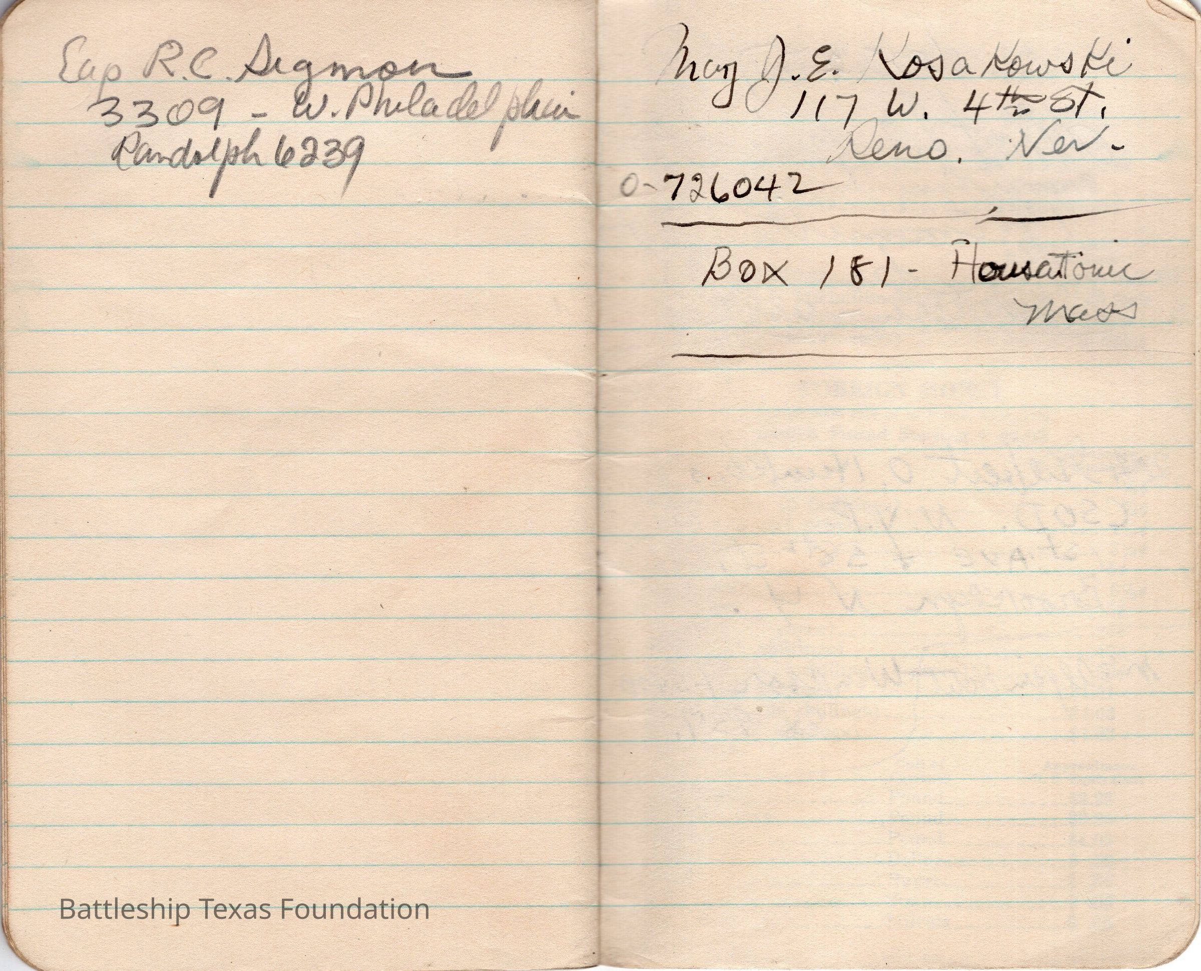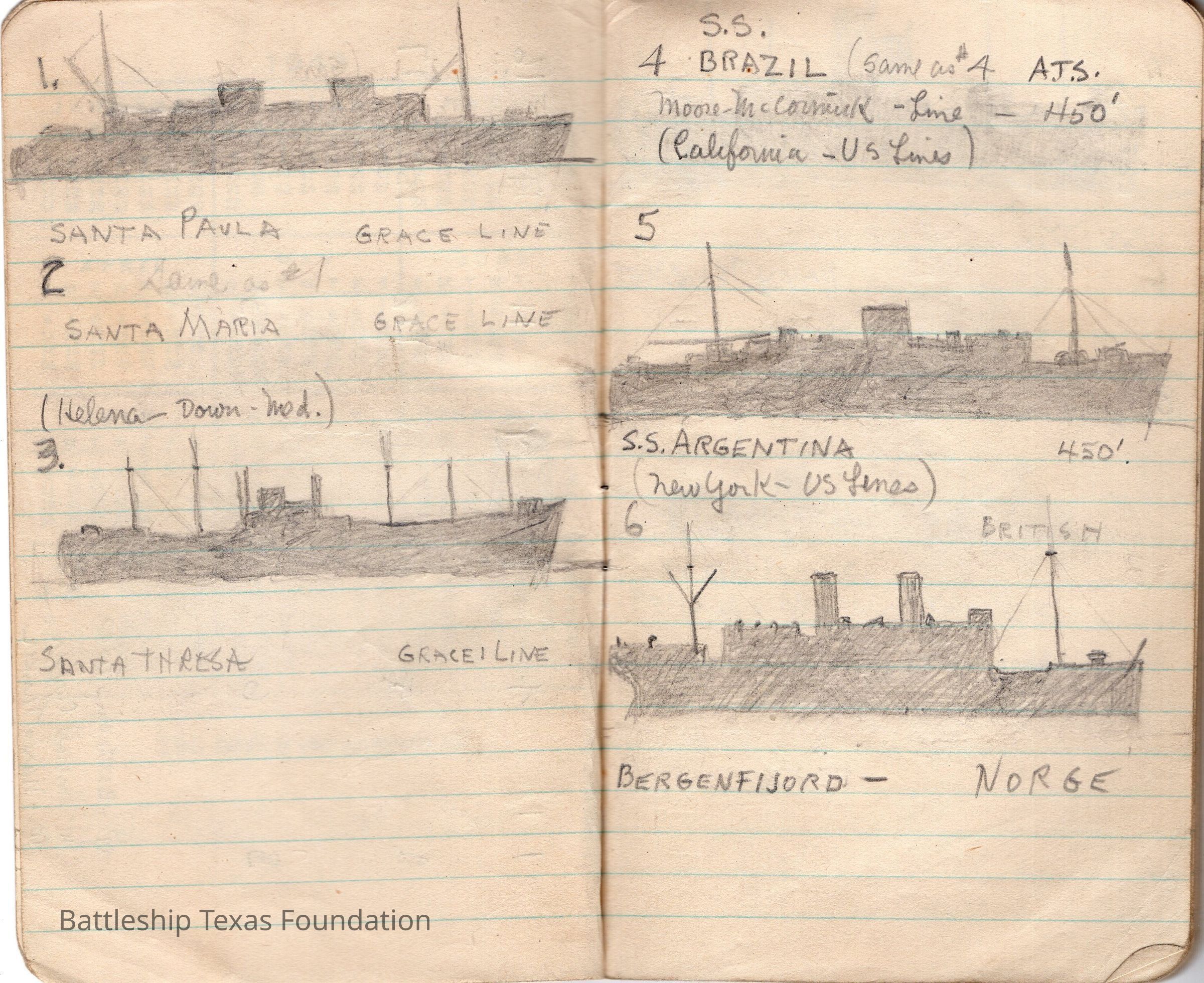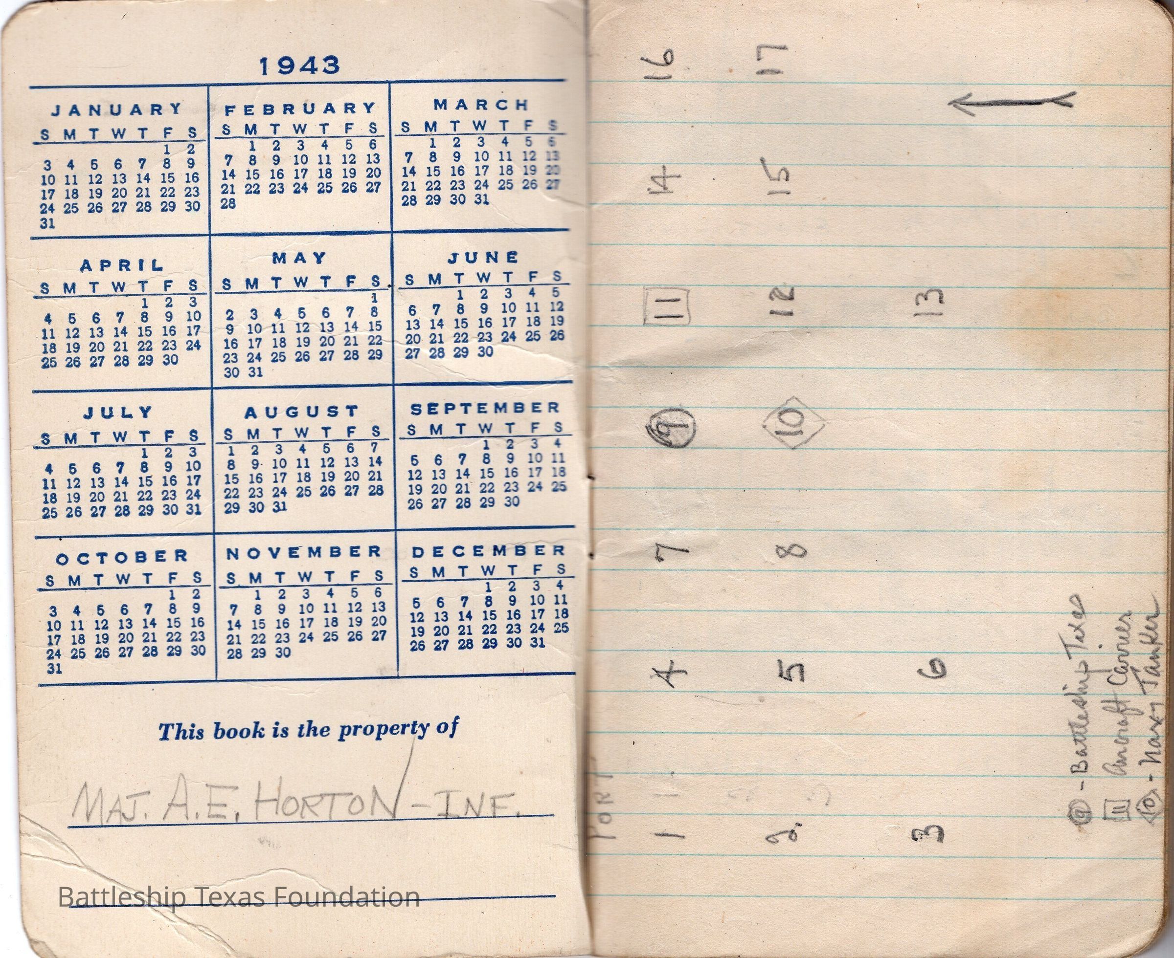 Notebook drawings by Major Alton E. Horton of the fleet Texas was a part of in 1943. Red cover with eagle perched on "NOTES" title. Bottom of the cover notes the book a product of the Coca-Cola Bottling Company. Notable ships included in the fleet drawings are USS Texas on page 9 and USS Santee (CVE-29) on page 6.