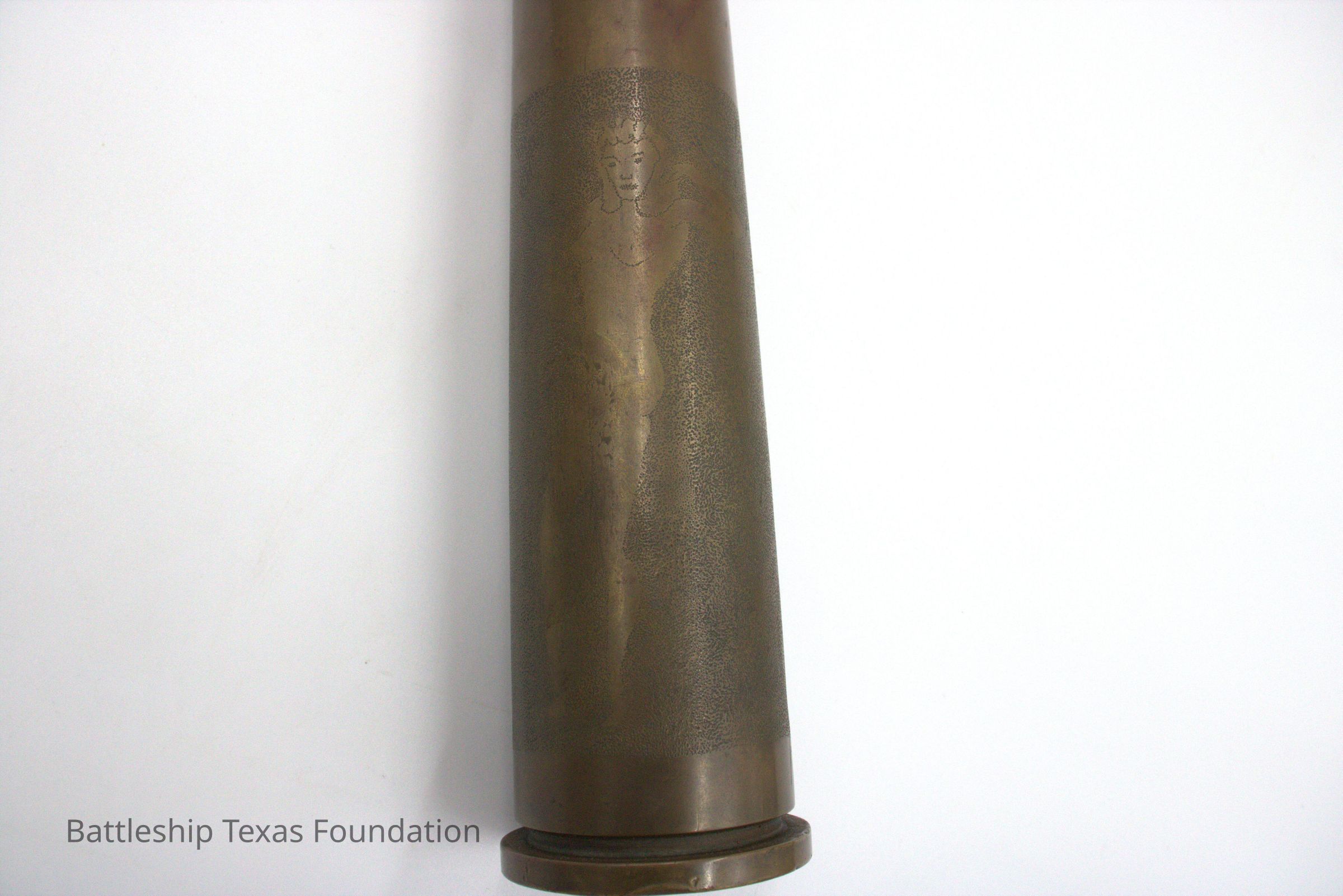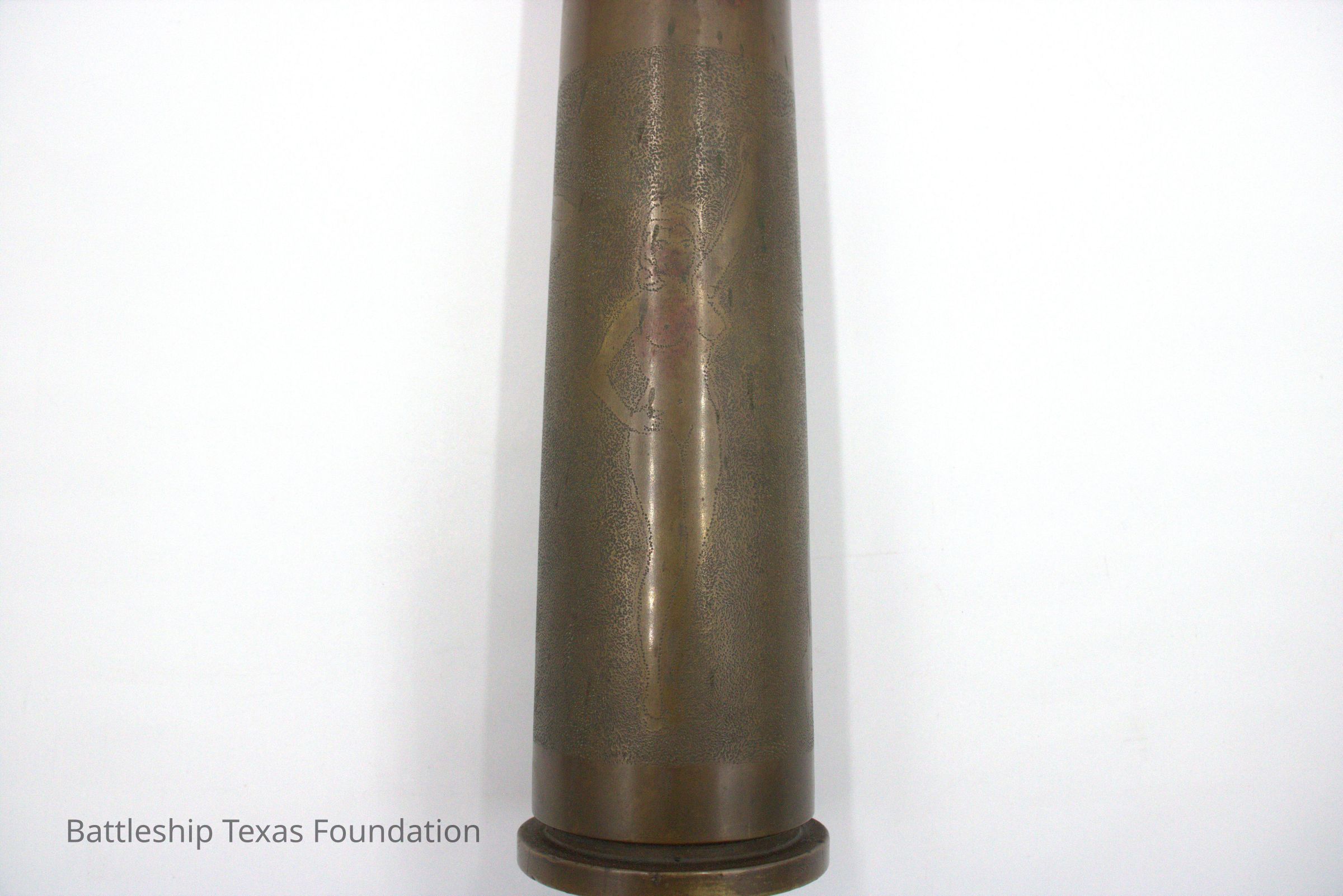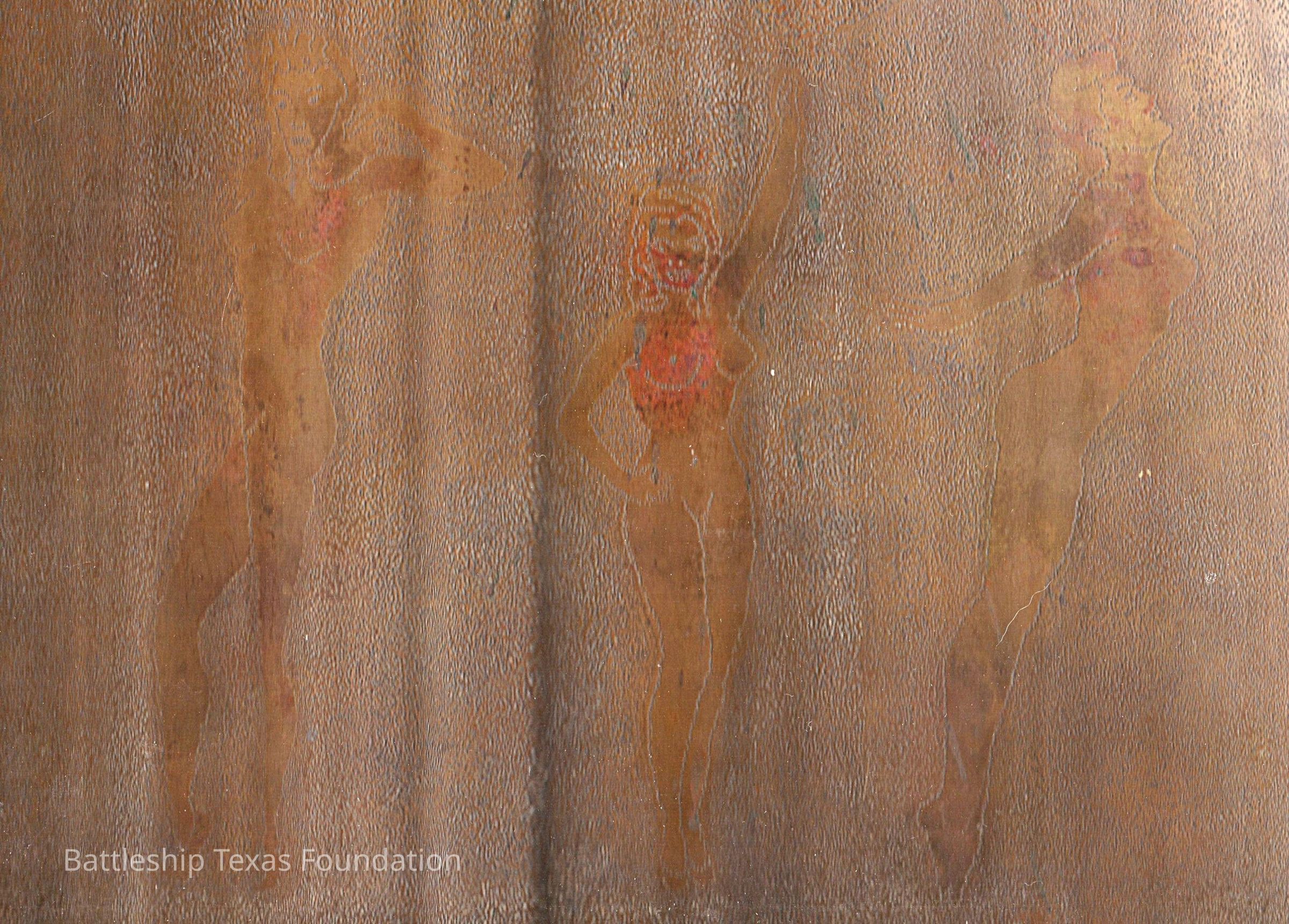 After the United States joined World War II, artistry on Battleship Texas faced a decline. Despite very few examples of crew member art from World War II in collection, Texas often became the subject of art by others in the fleet as they sailed alongside her. In 1943, Alton E. Horton’s troop transport was under the escort of Battleship Texas. When in port, Horton made meticulous effort to record the ships in the convoy with only a pencil and paper. These sketches acted much like a camera, allowing Horton to put to page the view he had before him without the use of an aperture. The second piece of WWII artwork is an etching of three women around the base of a 40mm shell. Trench art was a common mode utilizing discarded shell casings. Servicemembers shaped the brass into lamps, jewelry, ashtrays, and like in this instance, a canvas. The three nude women rotating the base of the shell are in line with trends throughout both World Wars. The nude form, while not the most popular visage, nonetheless saw widespread depiction. This piece of art was not done by a crew member; however, similar methods saw application in art donated to the Texas Parks and Wildlife Department.
