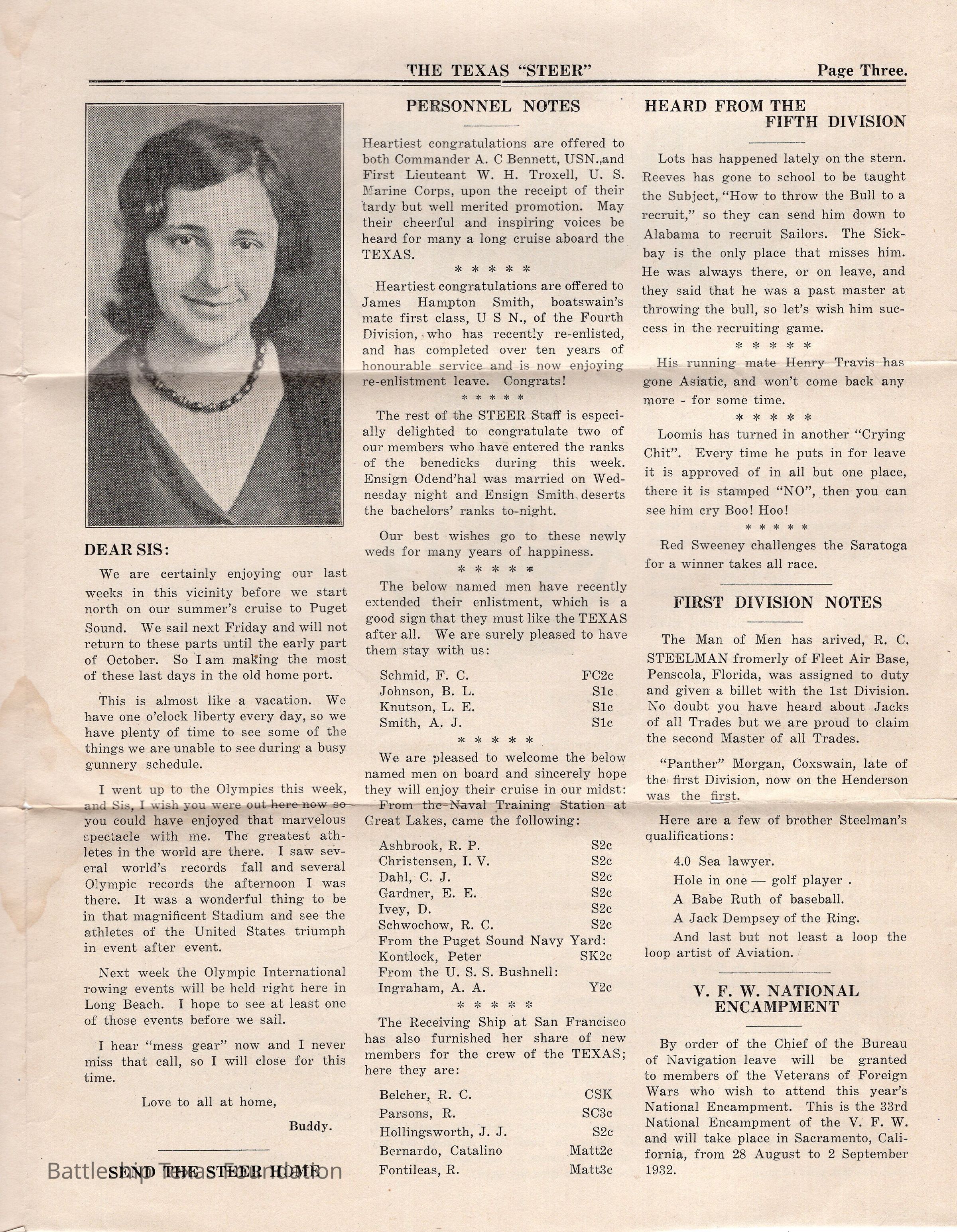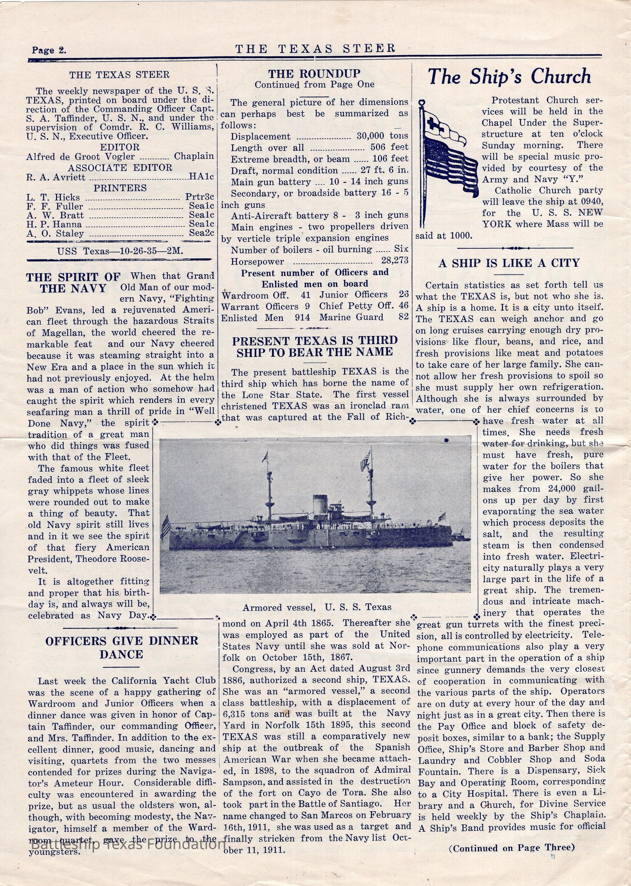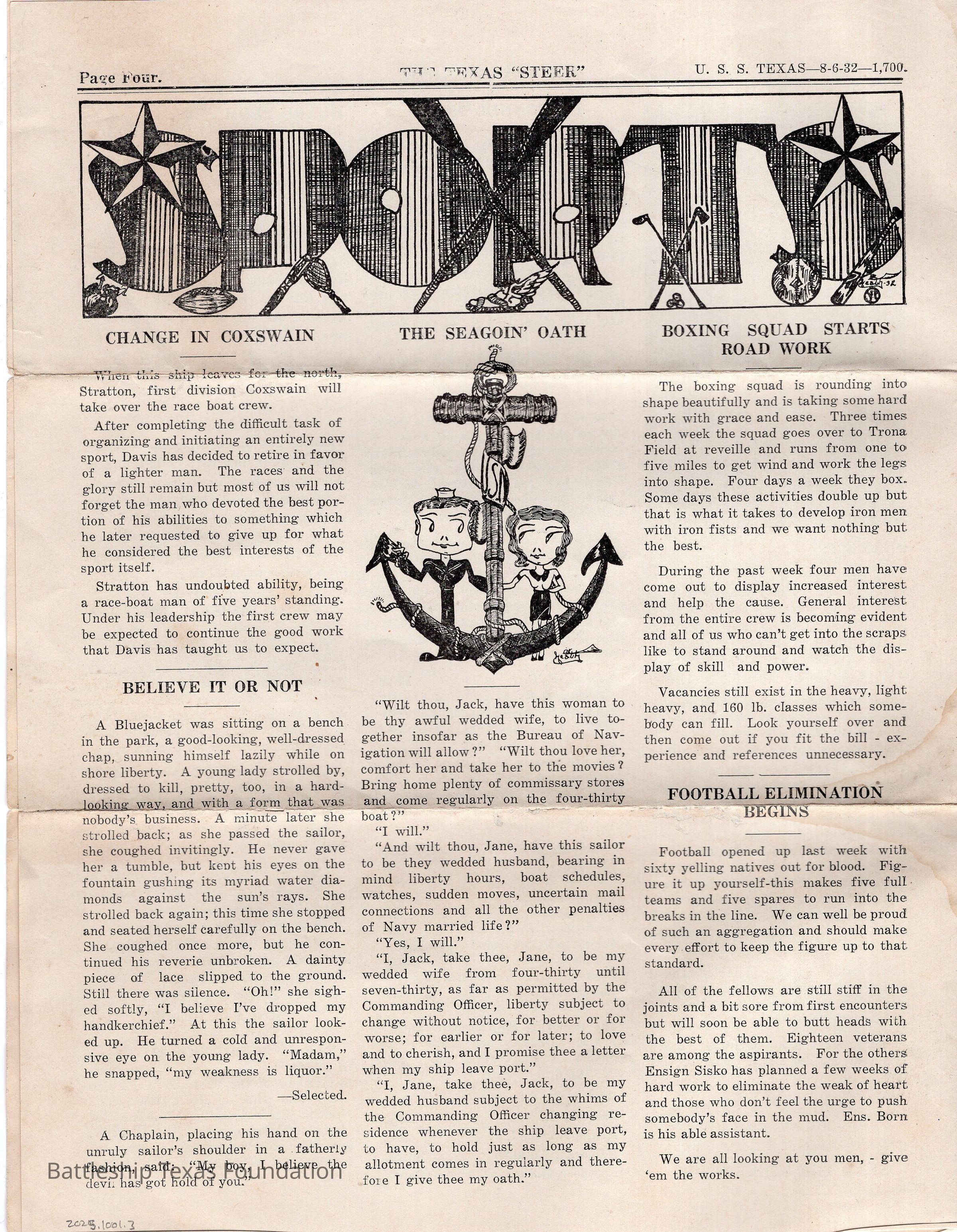 Battleship Texas was flagship of Battleship Division One from September 15, 1931, to June 27, 1937. She continued to participate in Fleet Problems throughout this period. “The Texas Steer” was a biweekly newsletter, started in 1924, and published by the crew of Battleship Texas. The paper was published until 1935, running a total of six volumes.