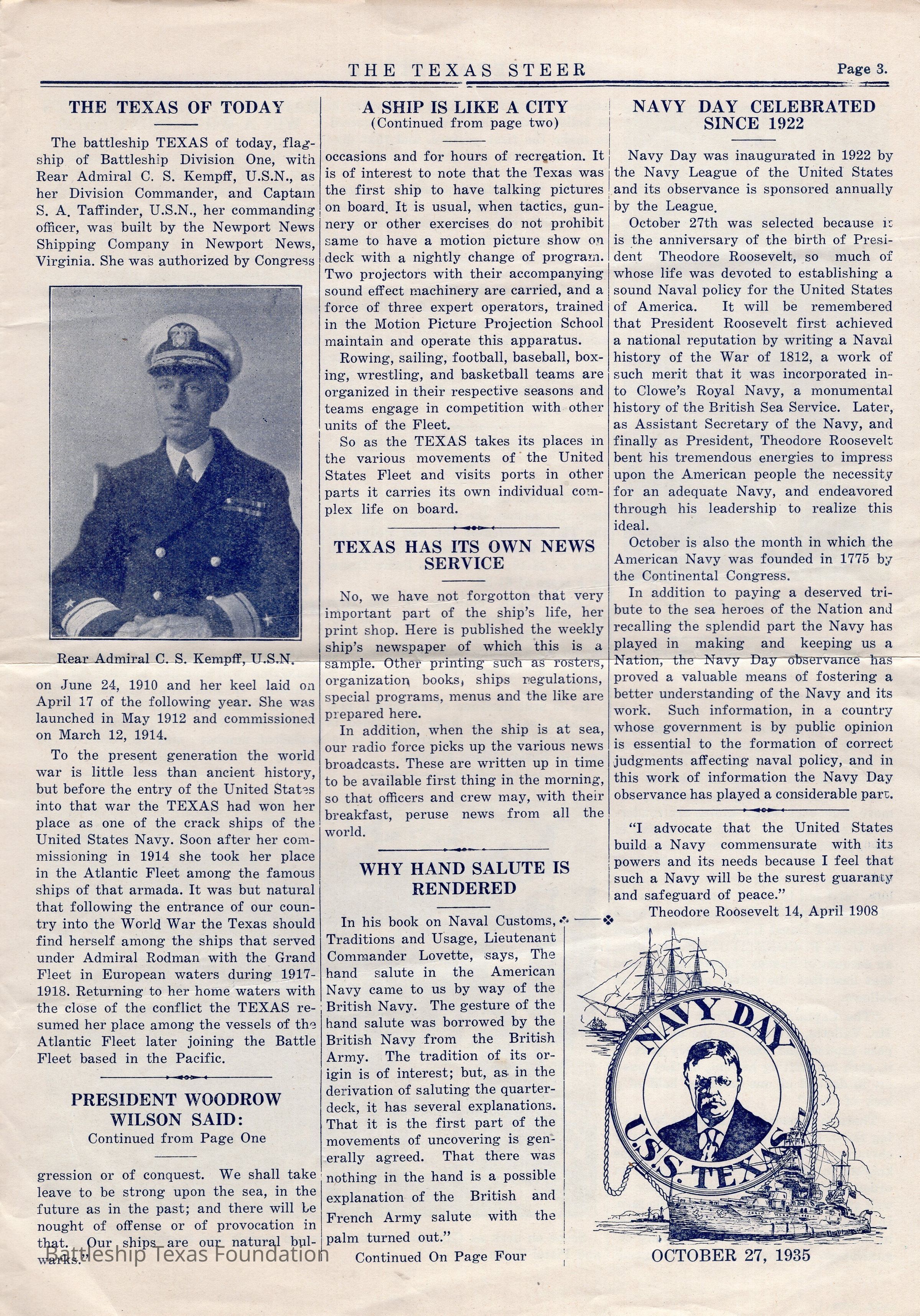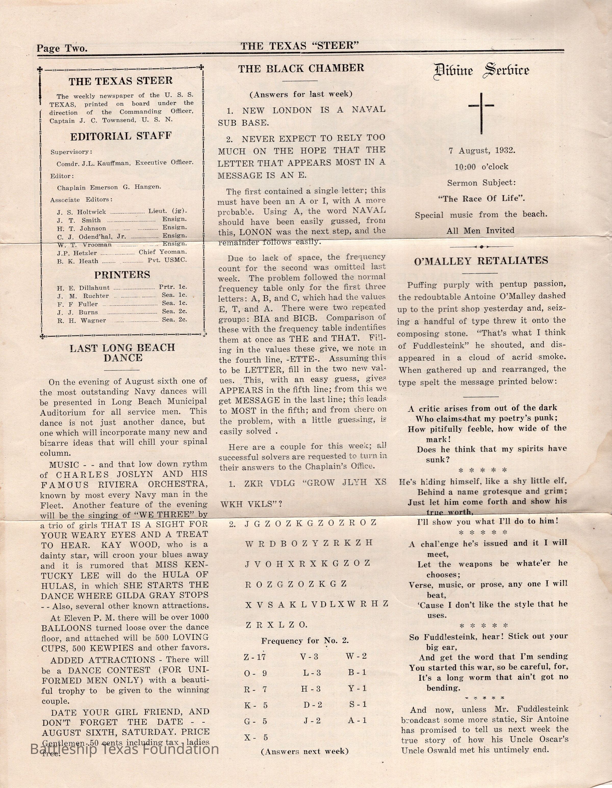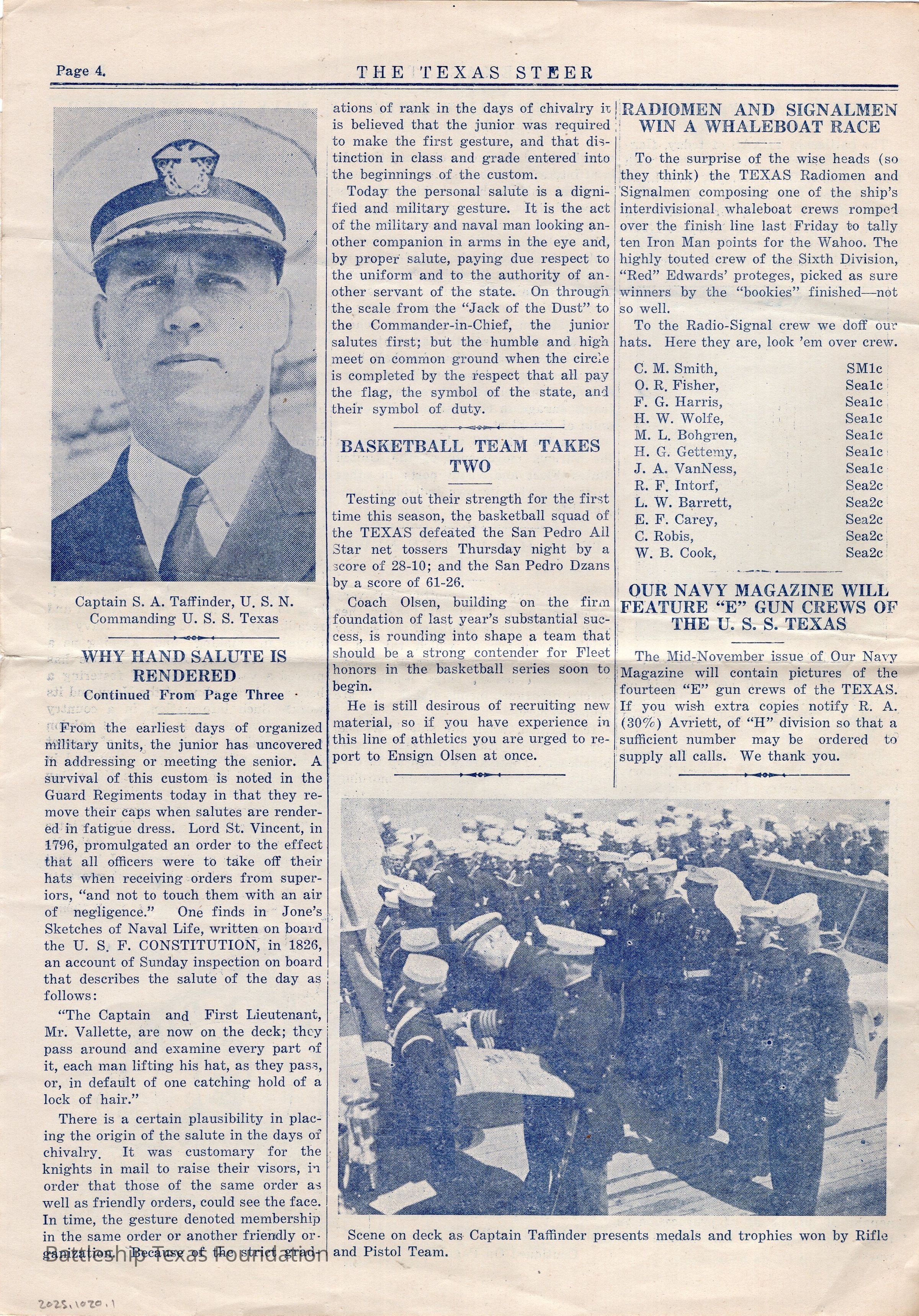 Battleship Texas was flagship of Battleship Division One from September 15, 1931, to June 27, 1937. She continued to participate in Fleet Problems throughout this period. “The Texas Steer” was a biweekly newsletter, started in 1924, and published by the crew of Battleship Texas. The paper was published until 1935, running a total of six volumes.