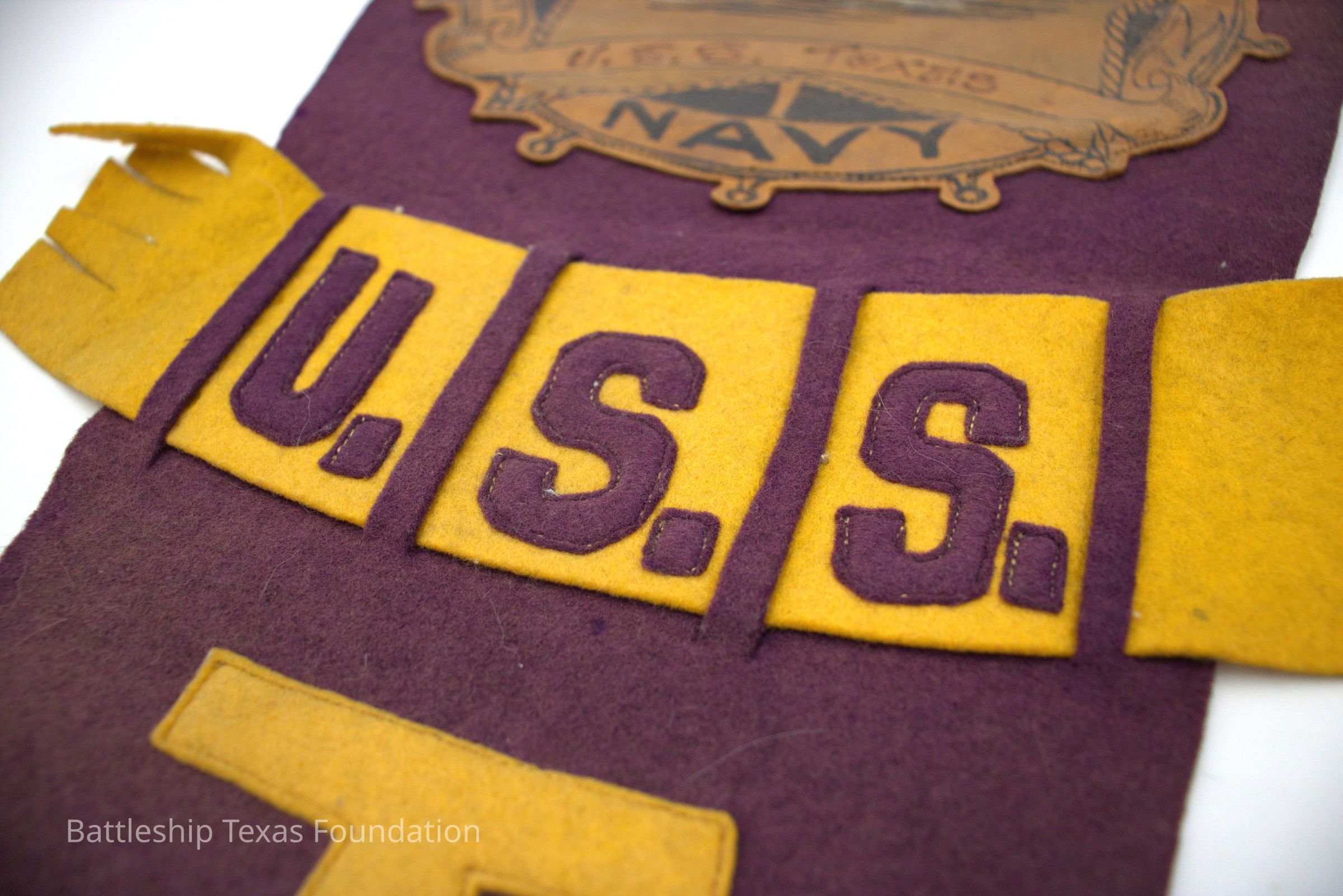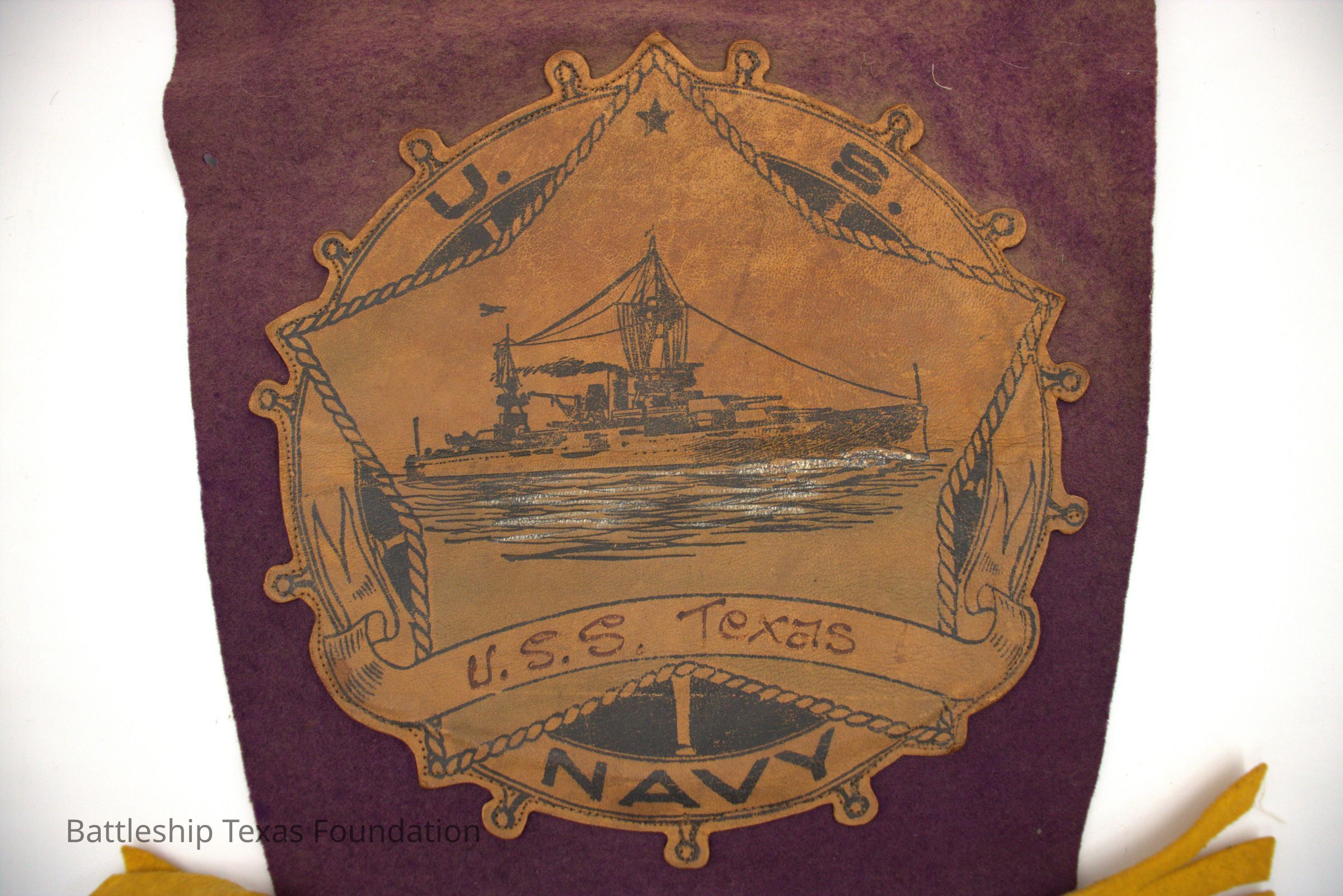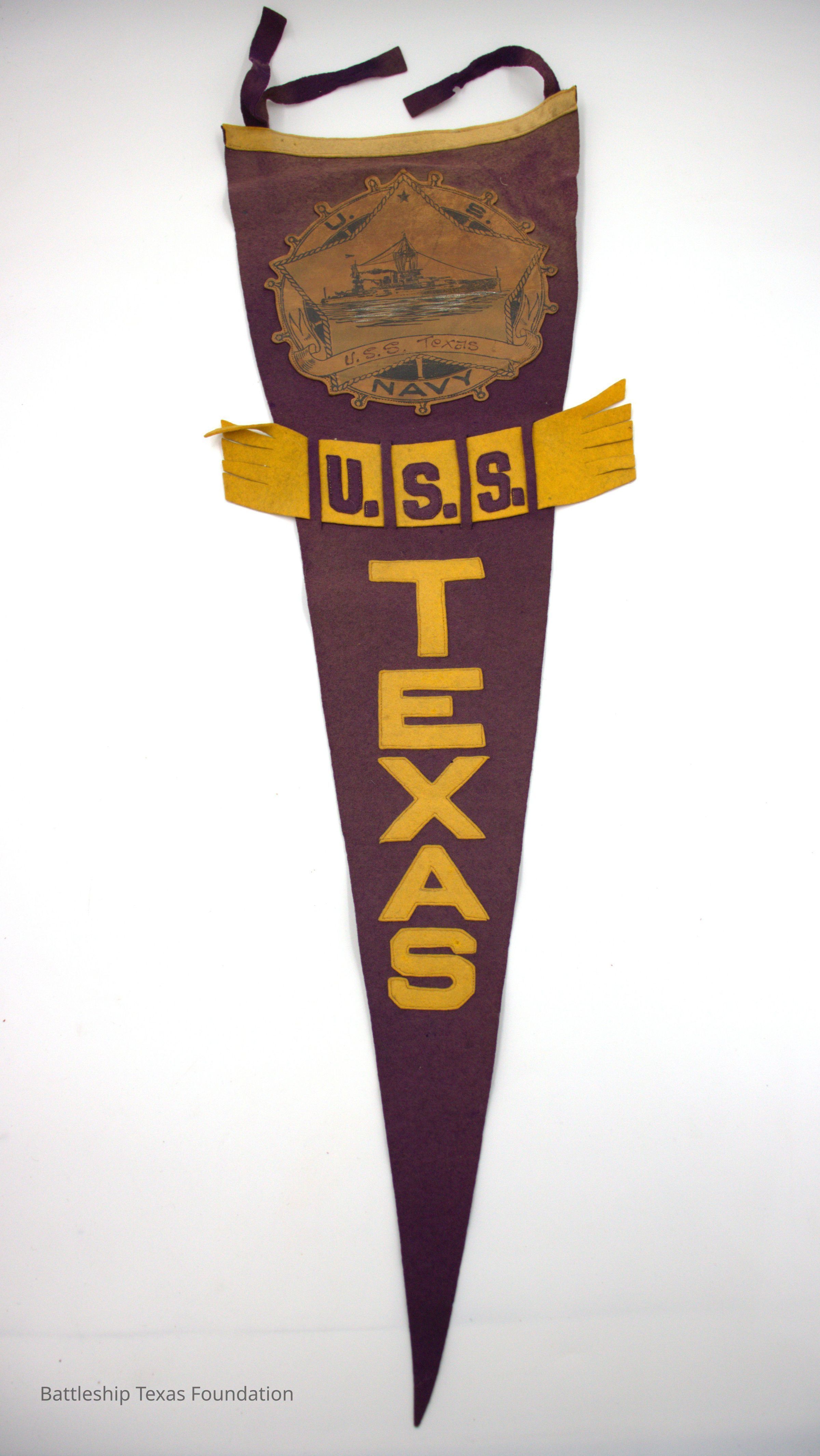 Purple and yellow triangular felt pennant. At the widest end of the pennant, the top end, is two ties on one side and one tie on the other. is a sewn on leather emblem. the emblem appears to be cut from a leather bound photo album cover. The emblem is in the shape of a wheel with a star overlaid over it with a ship in the center of the star. Below that is "USS Texas" hand written on the emblem. "USS" spelled out in cut out yellow felt letters horizontally across it; "TEXAS" is spelled out in cut out yellow felt letters vertically under the "USS".