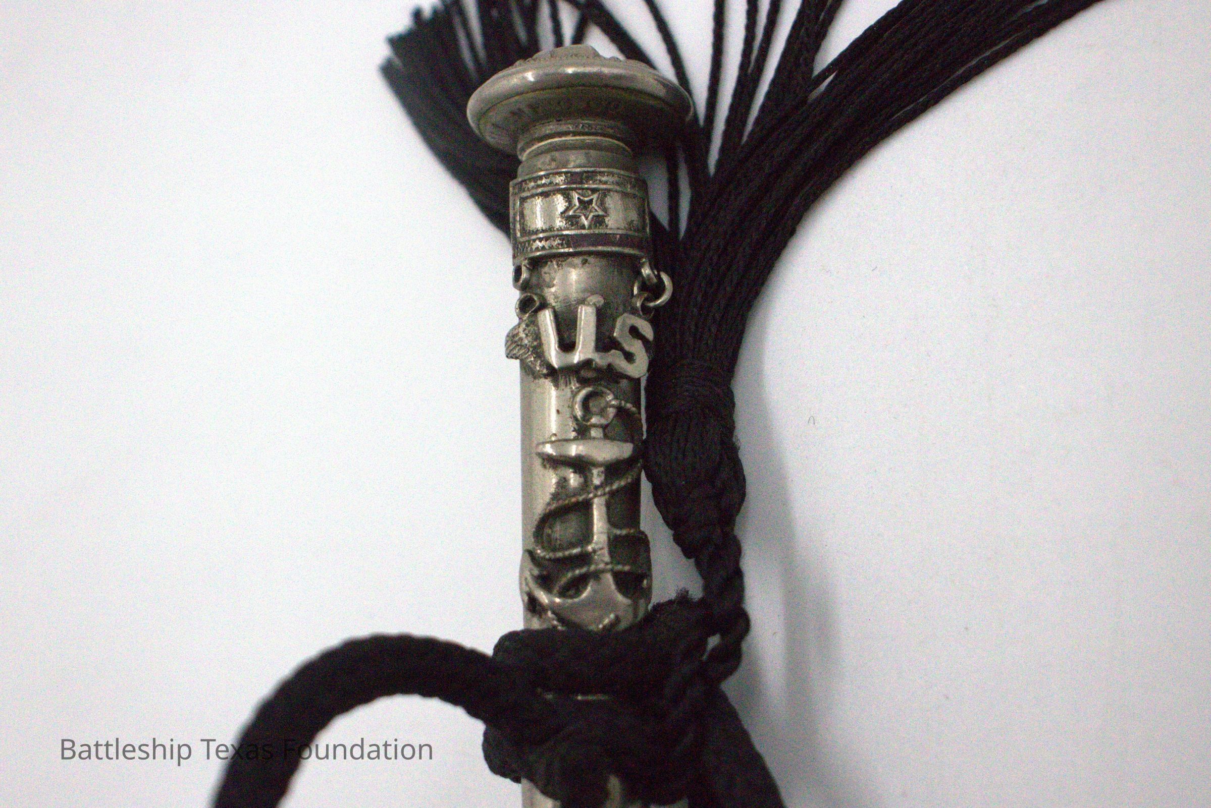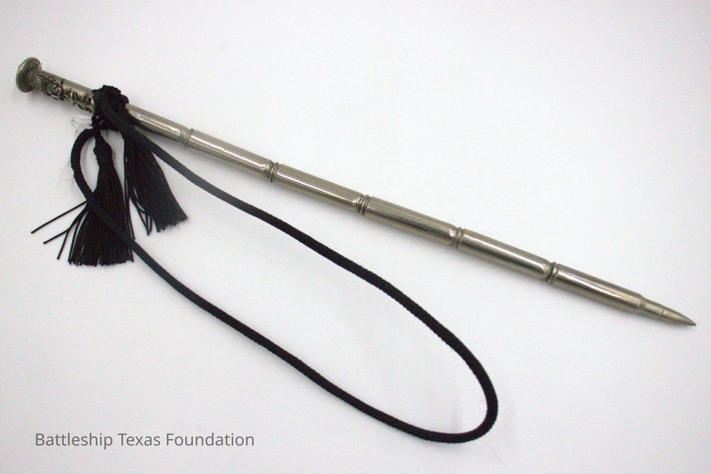 Custom swagger stick made by Lawrence Gaddis from seven bullet casings soldered together. The caliber of rounds used not present on Battleship Texas and are silver colored, likely from nickel plating. Black rope was tied around the end. Soldering weak between third and fourth bullet from base.