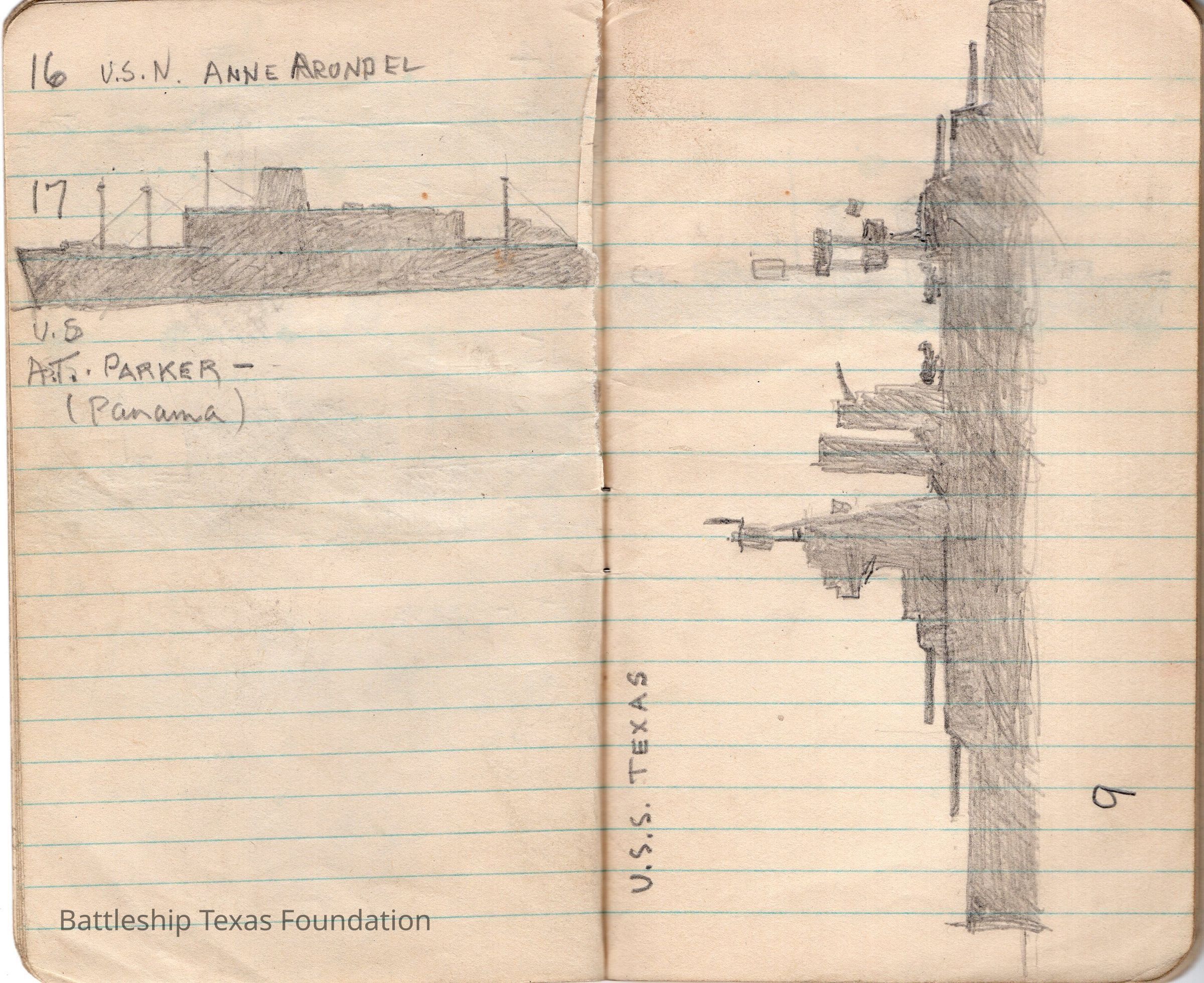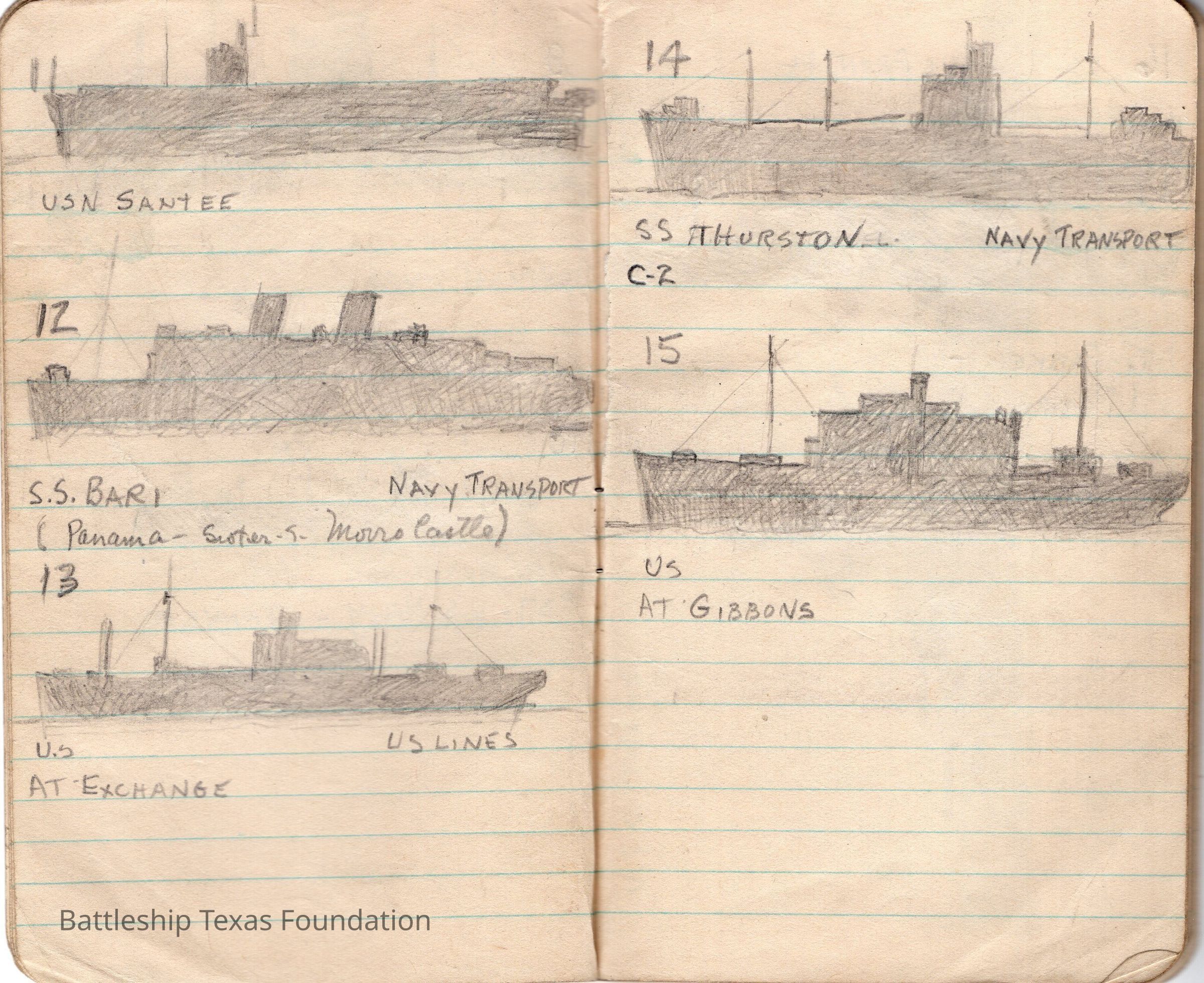 Battleship Texas largely escorted Allied ships across the Atlantic from January 1943 to April 22, 1944. She mainly sailed from New York to either the UK, Gibraltar, or Casablanca. Alton E. Horton was a soldier on a troop transport which was under escort of Battleship Texas in 1943. During his time at sea, he sketched many silhouettes of ships in the fleet. USS Santee (CVE-29) was originally commissioned (AO-29) as a Cimarron-class fleet oiler from October 18, 1940, to Spring 1942. She was converted and recommissioned as a Sangamon-class escort carrier from August 24, 1942, to October 21, 1946. She was sold for scrap to West Germany on December 5, 1959.
