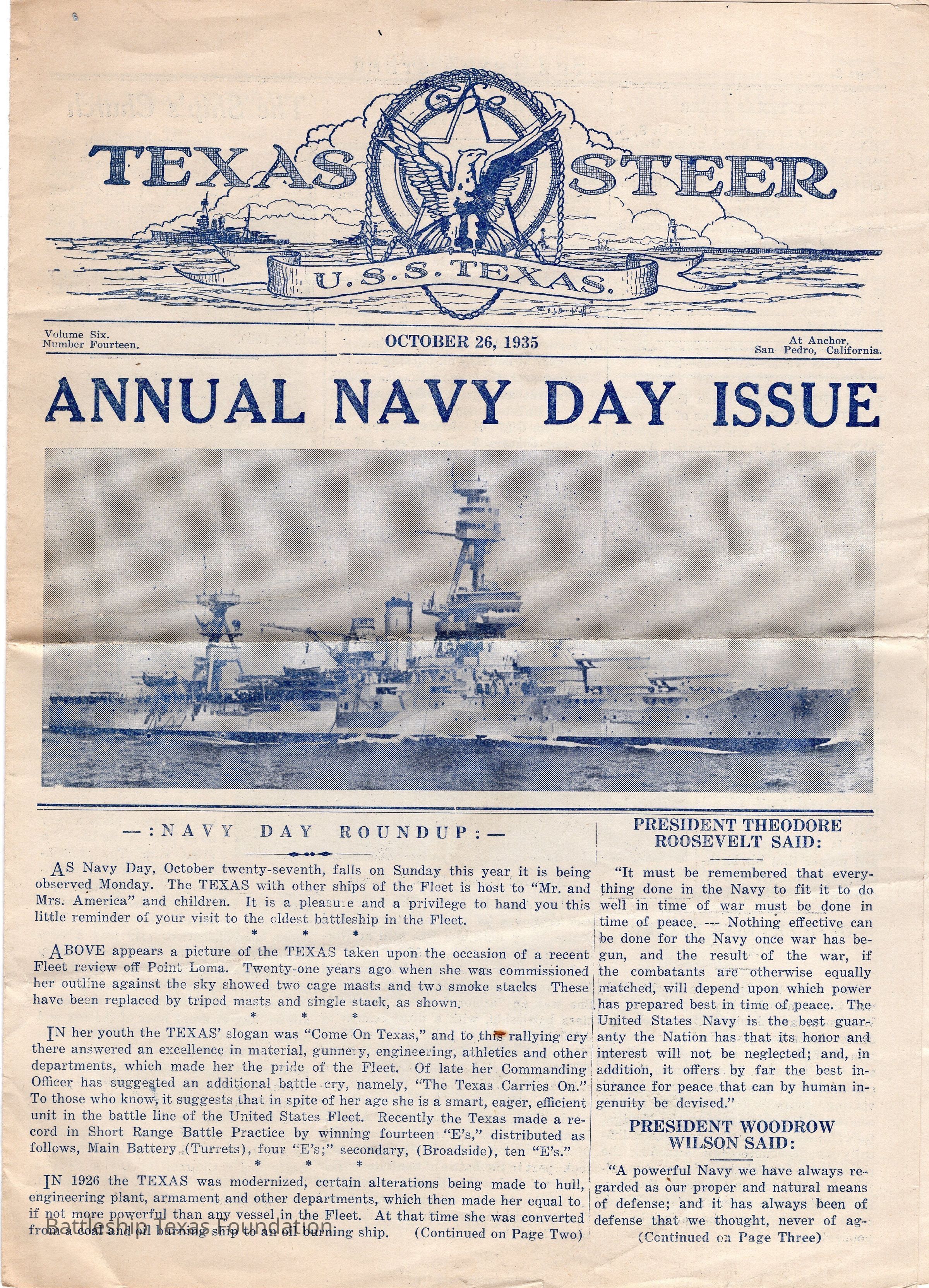 Vol 6 No 14 USS Texas published newspaper's "ANNUAL NAVY DAY ISSUE" from October 26, 1935, while at anchor in San Pedro, California. Artwork on the front by Elmer J. Birdsall. Magazine donated by Keith Fessenden.
