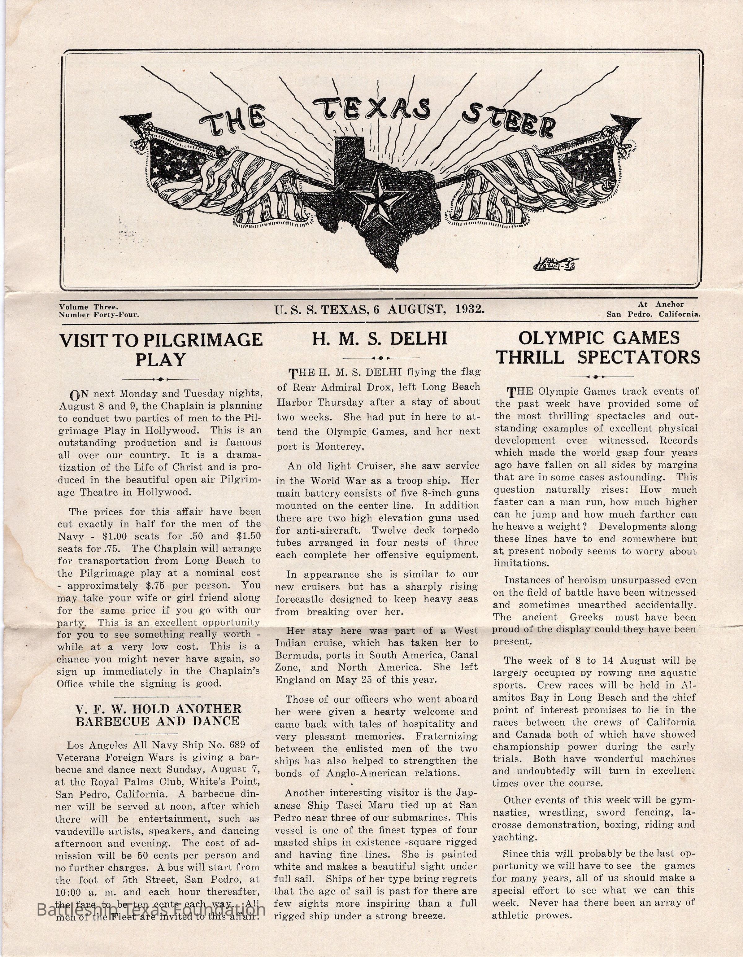 Vol 3 No. 44 USS Texas published newspaper from 6 August, 1932 while she was at anchor in San Pedro, California. Artwork on front and back by Buford K. Heath.