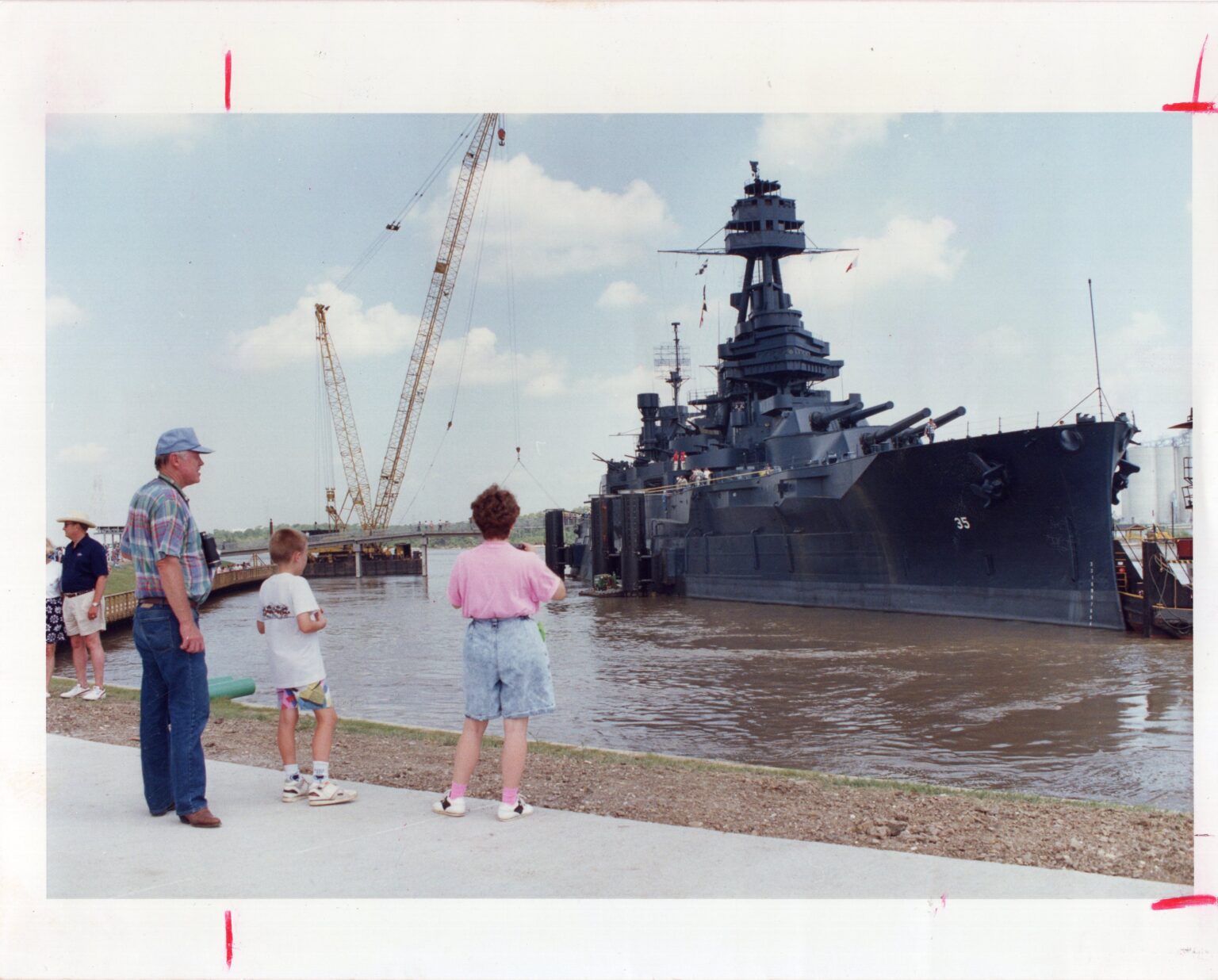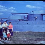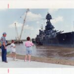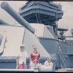 Museum goers participated in traditional photography in addition to film. Photographs carry different rules on handling from traditional paper. Nitrile gloves protect against fingerprints on the surface just as it does on 8mm. Traditional printed photographs are easier to archive due to their flat shape, but as the home movie proved, photography alone was not the sole method for moment capture. Battleship Texas received several 35mm slides, hundreds of which are preserved by Texas Parks and Wildlife Department, but these new donations were from the patrons who visited the museum, rather than TPWD’s cost effective method of photograph storage. The first shows a family near the entrance in 1950, and a pair of others showing a group perusing the deck in 1966. While the photography is distinct, and some archival techniques can differ, preservation methods remain the same. For general maintenance, keep the slides in a cool dry area, in an aid-free folder or polyester sleeve, and placed in archival boxes.