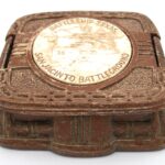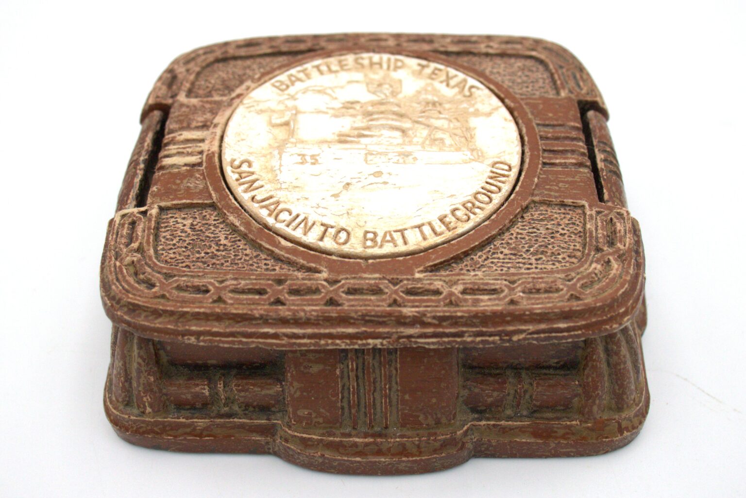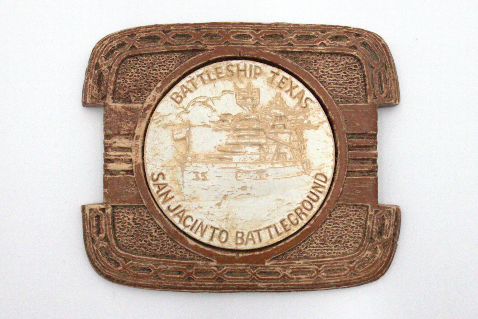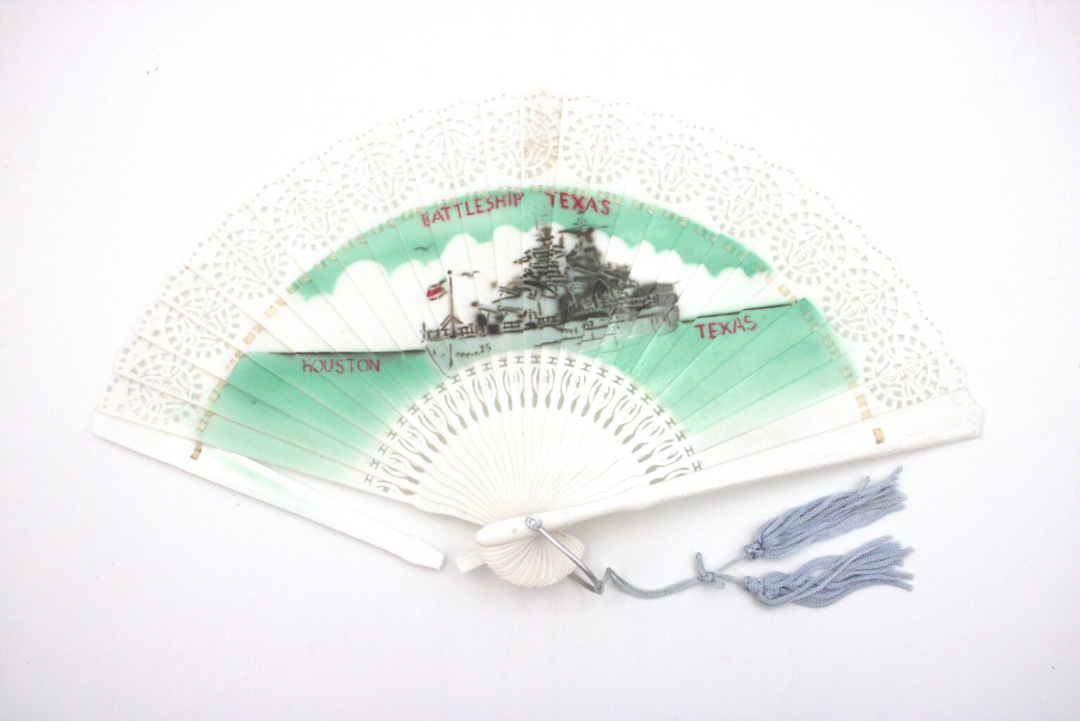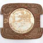 Photographs were not the only keepsakes collected by visitors. Memorabilia and ephemera, just as film and photograph, have made their way to Battleship Texas Foundation largely through donations of museum goers past and present. The first souvenir in collection is a simple plastic fan with a print of Battleship Texas on the face, dating between the late 1940s to the 1960s. Likewise present is a cigarette box adorned with a decorated puck on the lid. This was also a mass-produced object common in American landmarks throughout the 1960s where the puck offered the only variation. Some other examples of this have built-in ash trays. Storage for both is simple enough, although the box’s use of water-soluble paint makes a dry environment all the more necessary. Both pieces should be stored in boxes using archival paper for cushioning.