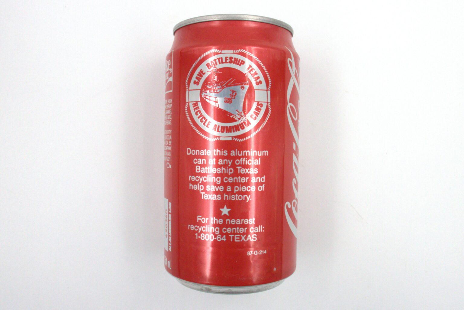 By the late 1980s, Battleship Texas had welcomed guests for four decades. While commissioned in the Navy she received regular time in ship yards and dry docks, she did not have access to such luxuries as a museum ship. Of the many methods to raise funds, Texas Parks and Wildlife Department partnered with Coca-Cola to raise funds through recycling of soda cans. Coke cans carried the message, “Donate this aluminum can at any official Battleship Texas recycling center and help save a piece of Texas history.” Aluminum does not visibly rust in humid environments like steel, nor does it tarnish due to sulfur-containing gases in the air like silver or bronze. Simply keep aluminum objects dry and free of salt or acids — such as in an indoor environment — and it will last indefinitely without maintenance. To ensure Stabilization, the can is placed in an archival box wrapped in acid-free paper for protection. Fundraising campaigns like these, helped bring the ship to dry dock and ensured she survived to her recent dock period three decades later.