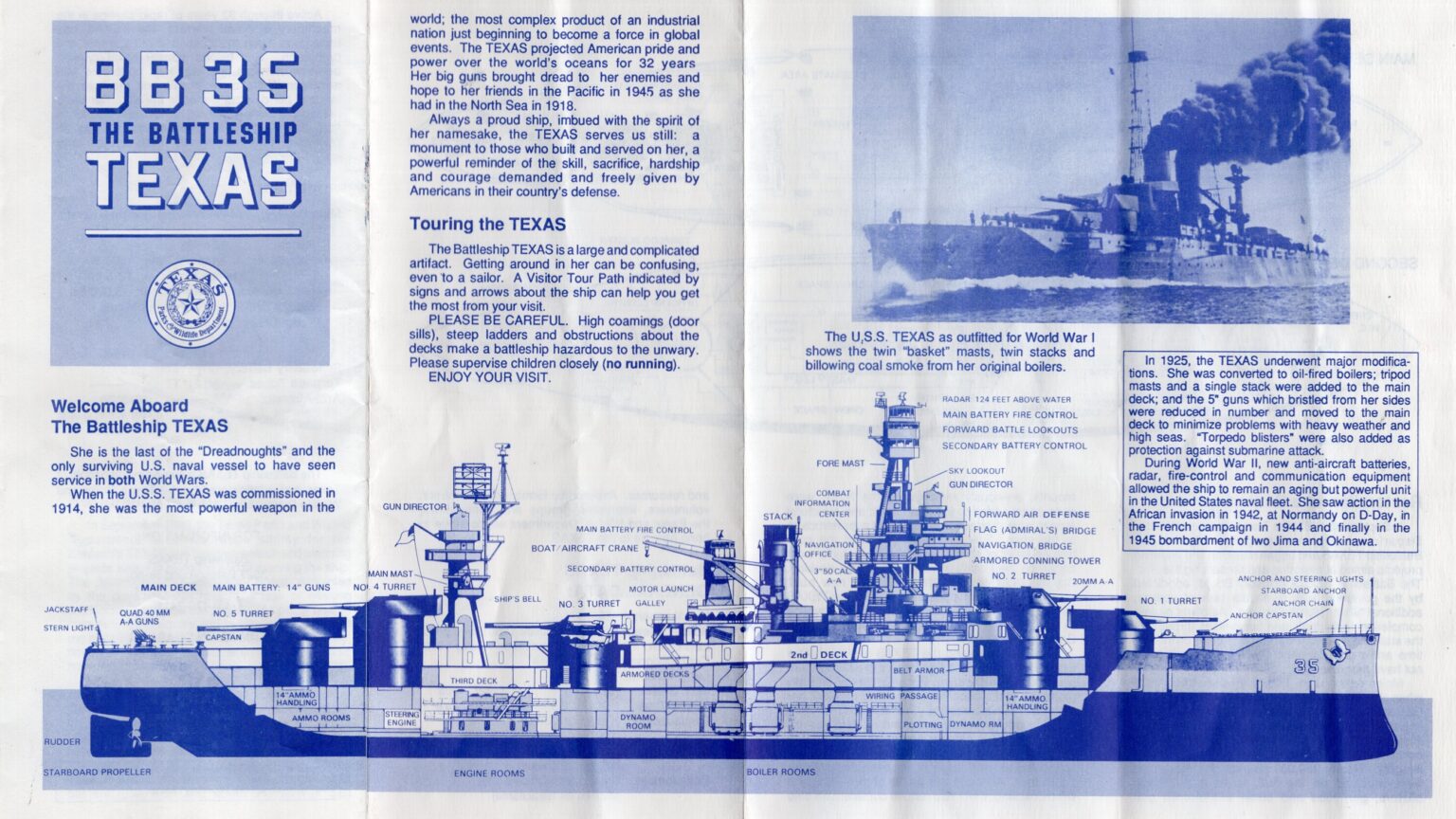 Walking on her main deck one sees an array of weapons. They are long since obsolete, but it was with these guns that Texas helped defeat the enemy in two world wars. Just as a woman exhibits her diamonds and other jewelry, so this “lady” shows off her most precious gems—her big guns—to thousands of tourists.Chaplain M. Terry Hall in “USS Texas Museum” in All Hands magazine Nov 1977