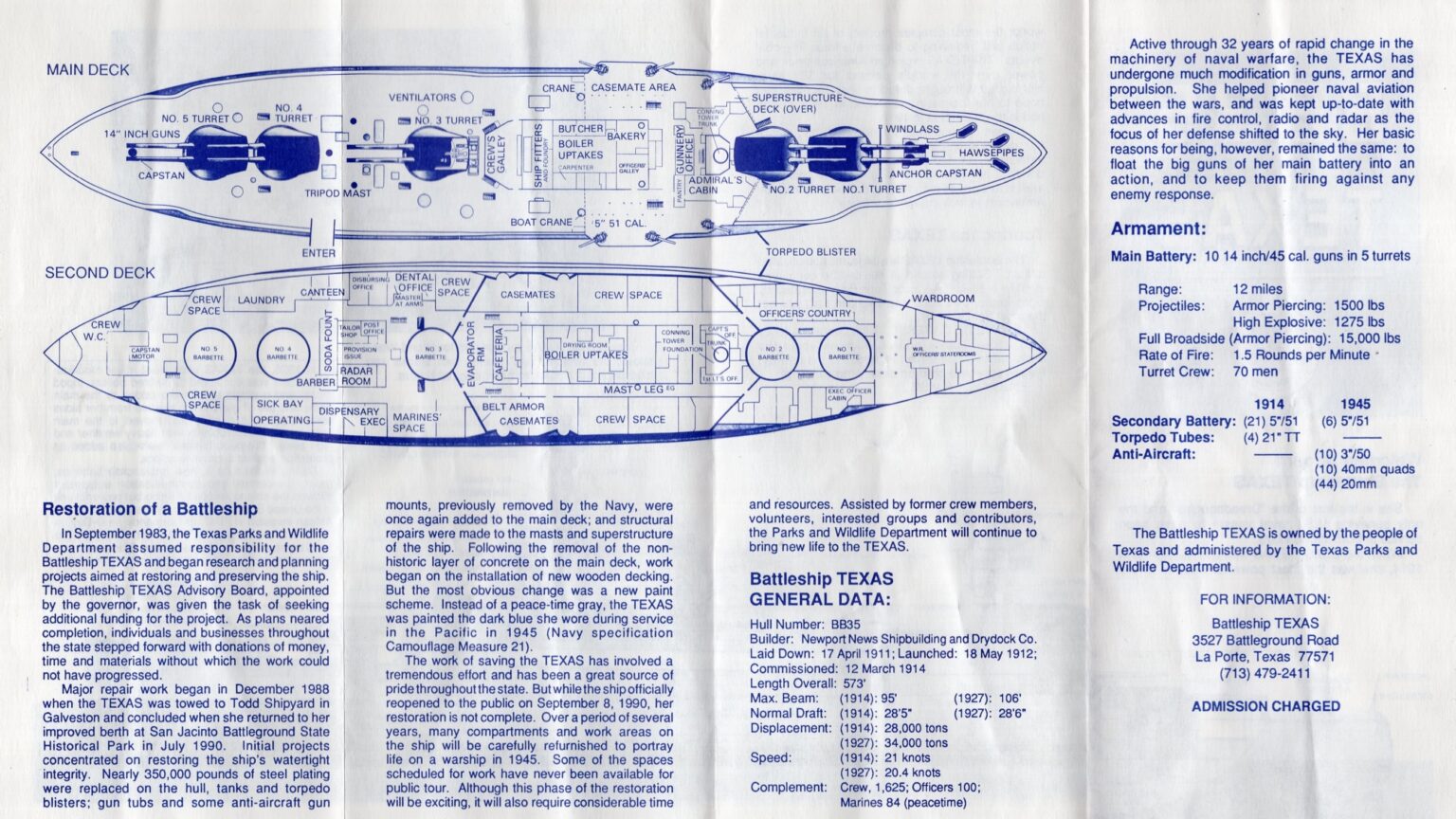 Battleship Texas has a storied history across her thirty-four years of service from 1914 to 1948. Despite that longevity, she has spent more time as a museum than she did in commission. Beginning in January 1946, Texas sailed to the east coast and began preparation for deactivation and donation to the State of Texas. More than two years later, the Navy towed Texas up the Houston Ship Channel where she was decommissioned at a slip in San Jacinto State Park on April 21, 1948. While older ships exist as museums across the United States — such as Olympia in Philadelphia, Pennsylvania — each transitioned into a museum role after Texas began her tenure at San Jacinto State Park. Battleship Oregon had a brief tenure as a museum from 1925 to 1942, but the State of Oregon donated her back to the Navy during World War II, and she was later scrapped, whereas Texas retains the title of oldest permanent museum ship. Battleship Texas Foundation is dedicated to preserving not only the history of her time in the Navy, but also her time as a museum and collecting artifacts of note throughout her time welcoming visitors from 1948 to present day.